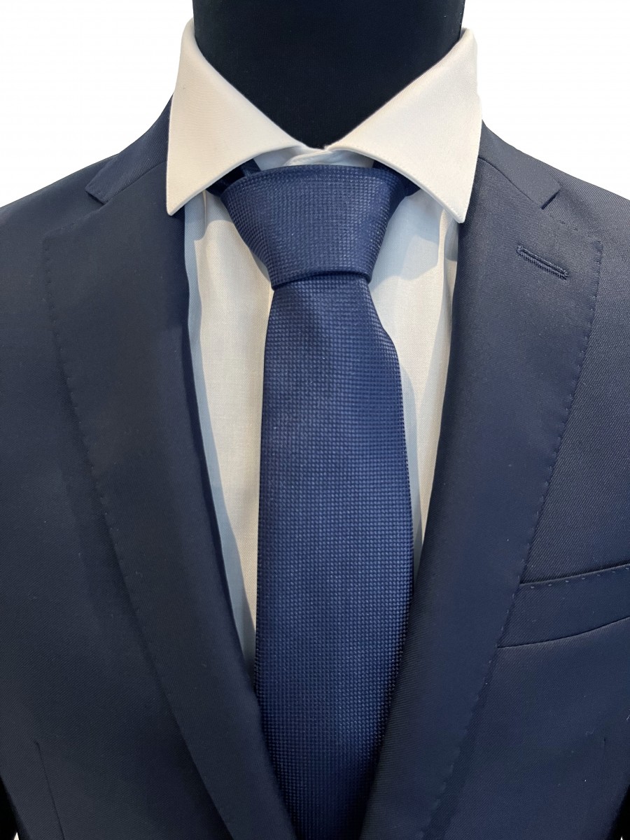 Cravate texturée à nouer. Coloris bleu marine. Texture en carreaux. 148cm x 7,5cm. Disponible en 40 coloris.