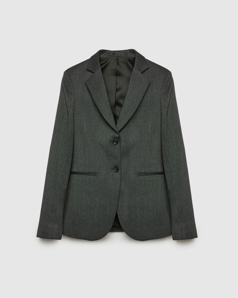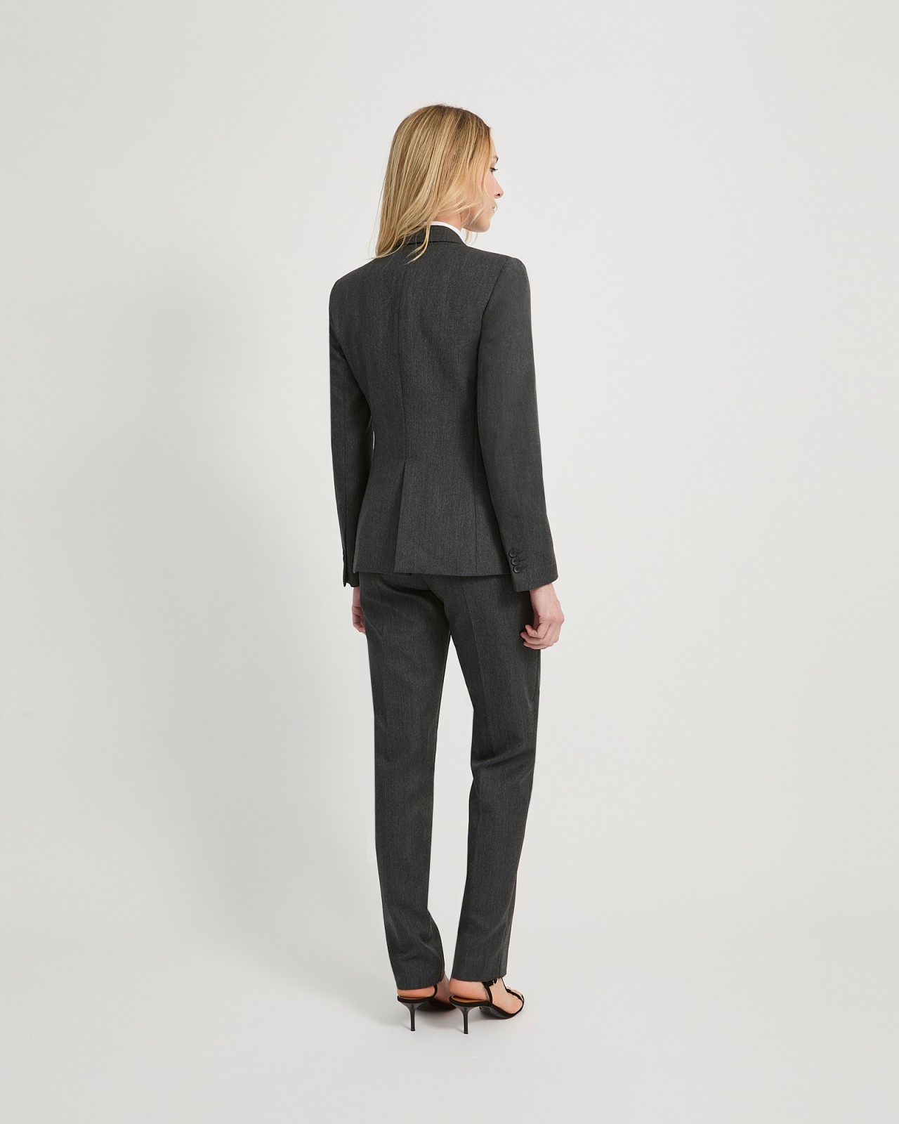 Veste doublée col classique. Fermeture par deux boutons. Deux poches double passepoil et une poche poitrine simple passepoil. Pinces devant et une fente dos.