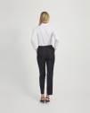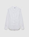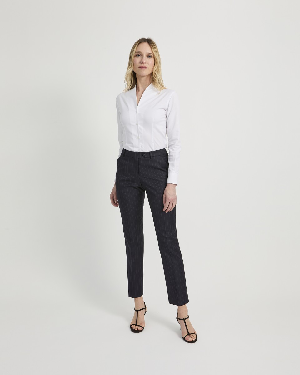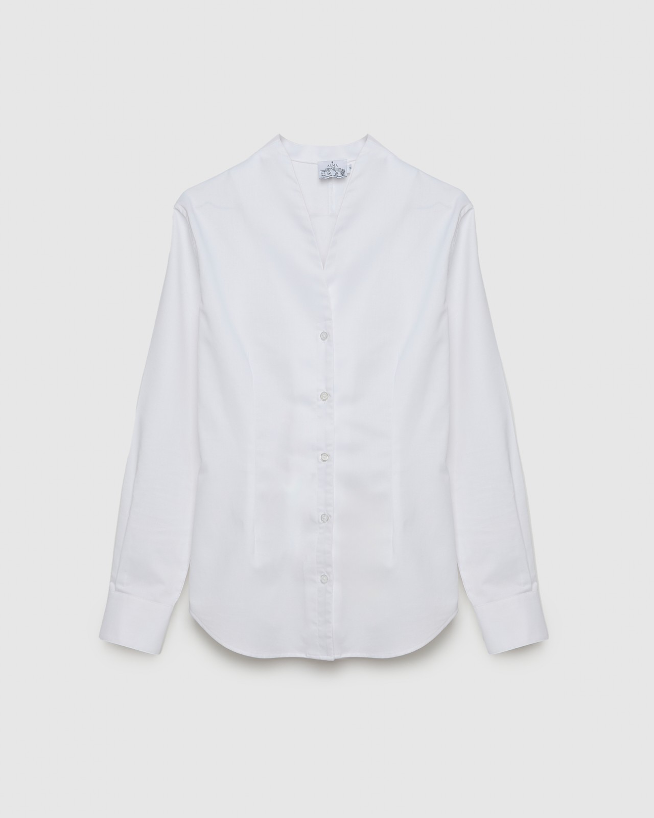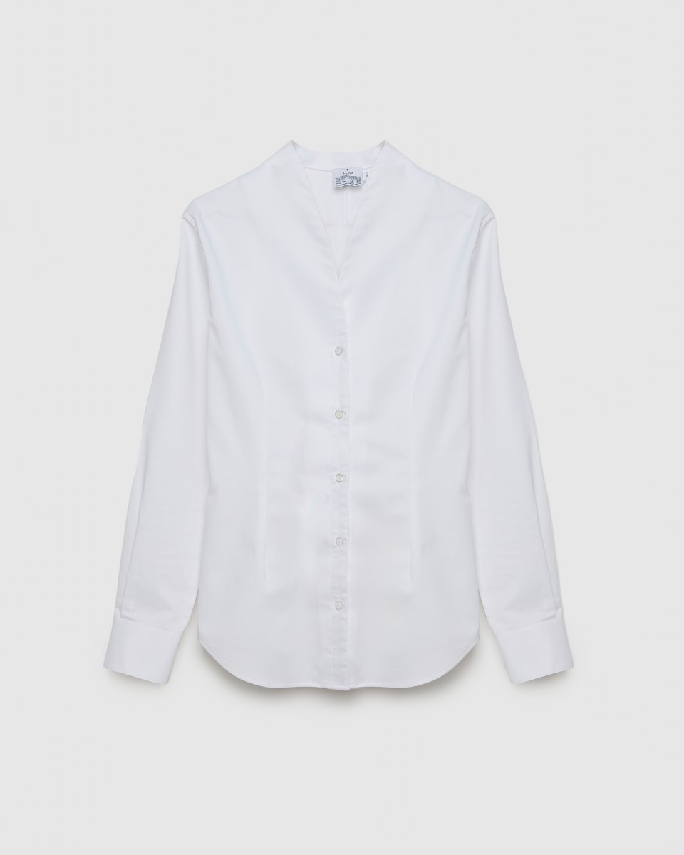 Chemise col V arrondi. Fermeture par 5 boutons. Manches longues avec poignets boutonnés. Sans poches. Pinces devant/dos.