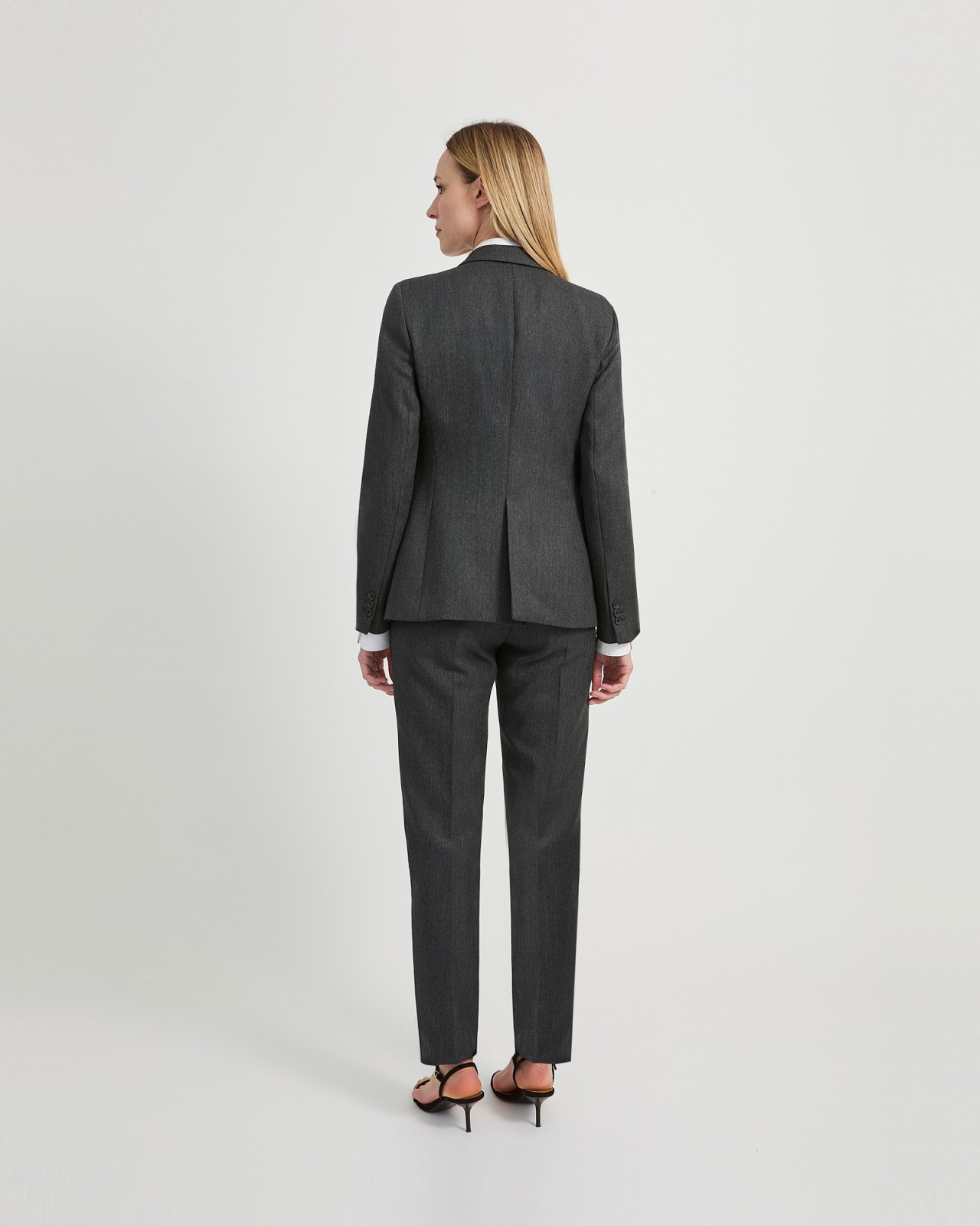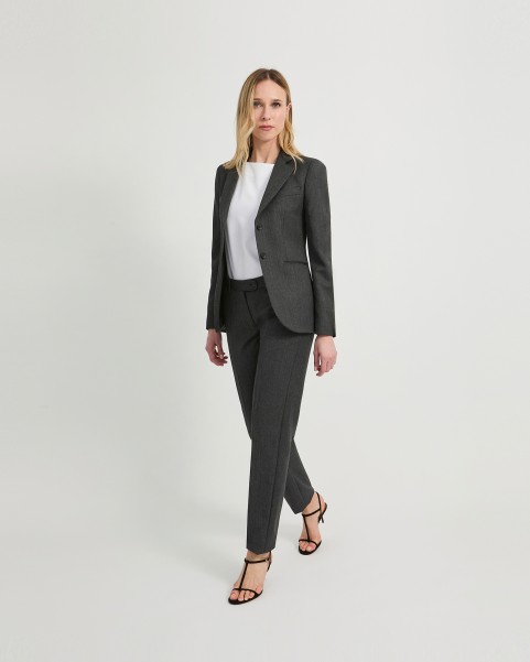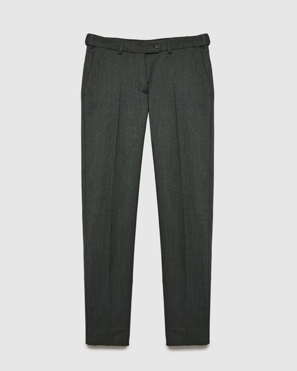 Pantalon coupe ajustée avec ceinture semi-élastiquée. Fermeture éclair et bouton de ceinture. Deux poches italiennes devant et deux poches dos passepoilées. Plis de repassage devant.
