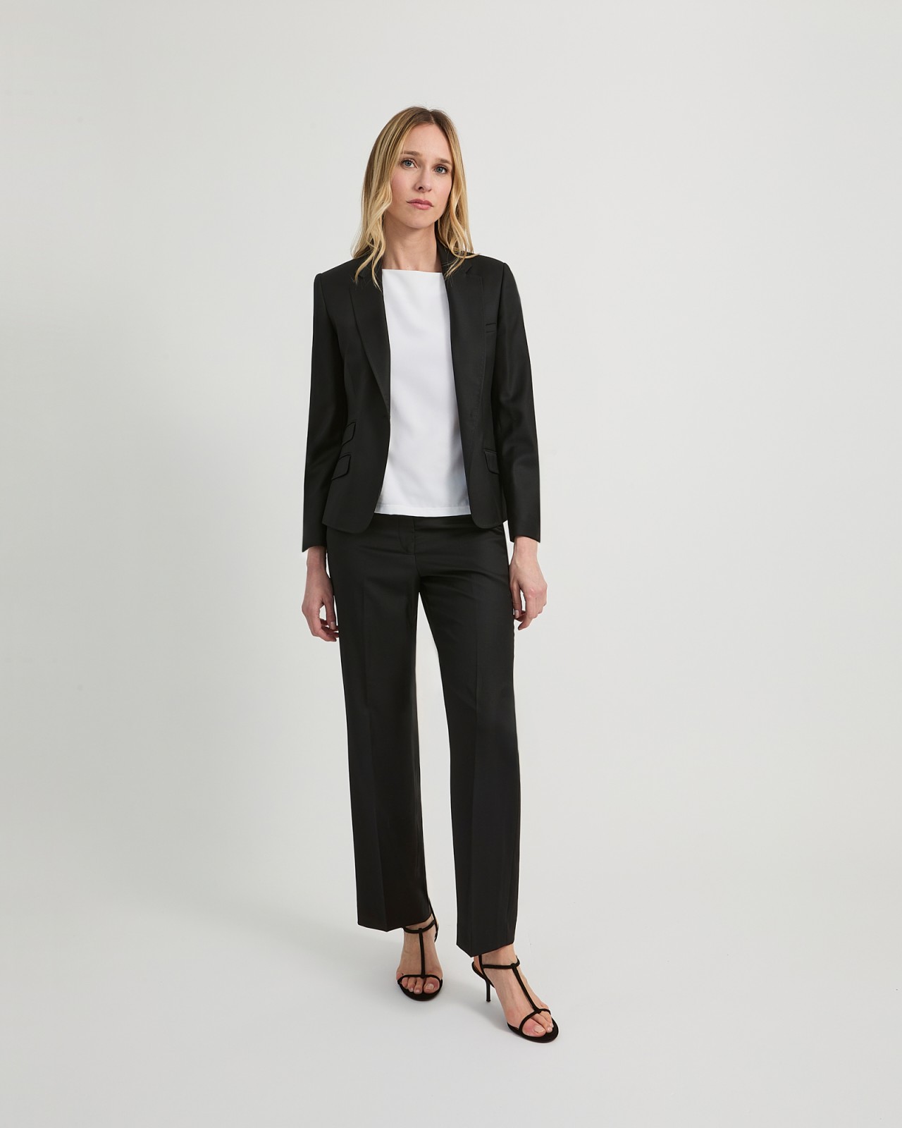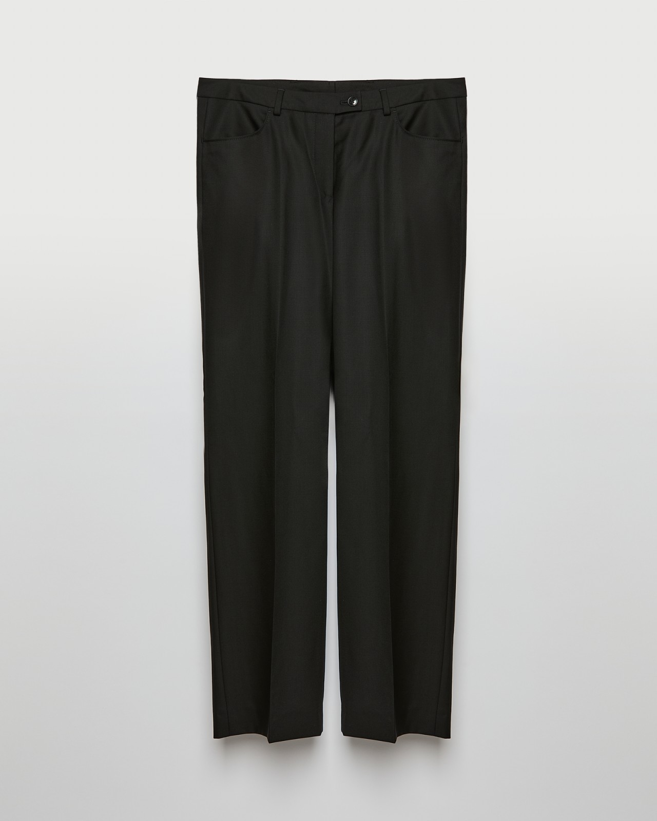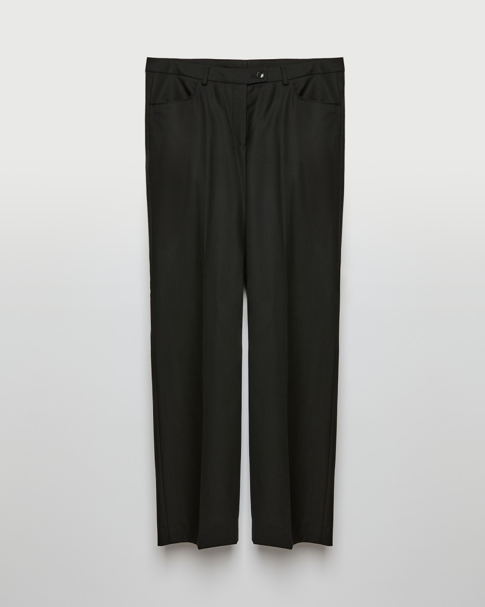 Pantalon coupe droite avec ceinture rapportée. Fermeture éclair et bouton de ceinture. Deux poches cavalières devant et deux poches dos passepoilées. Plis de repassage devant.