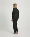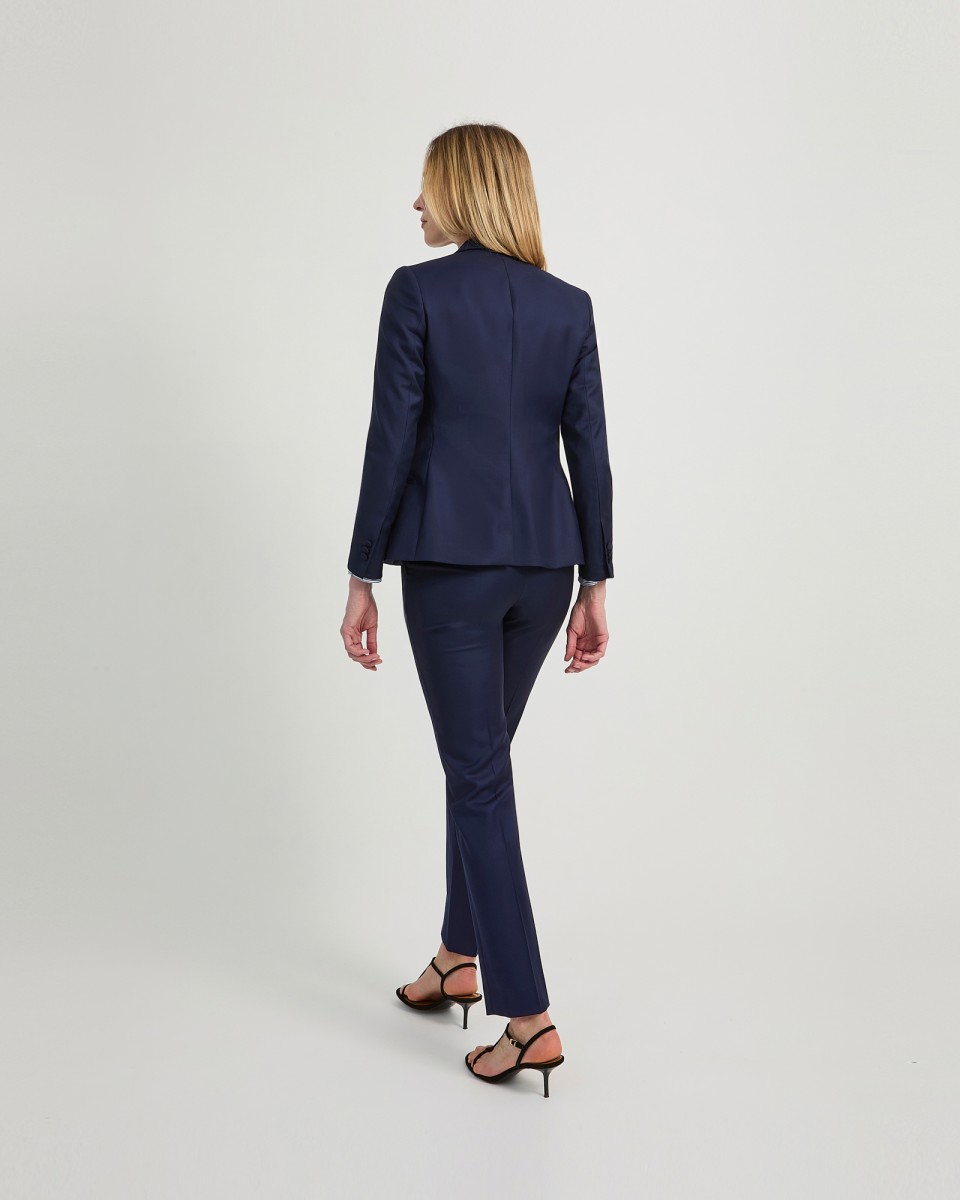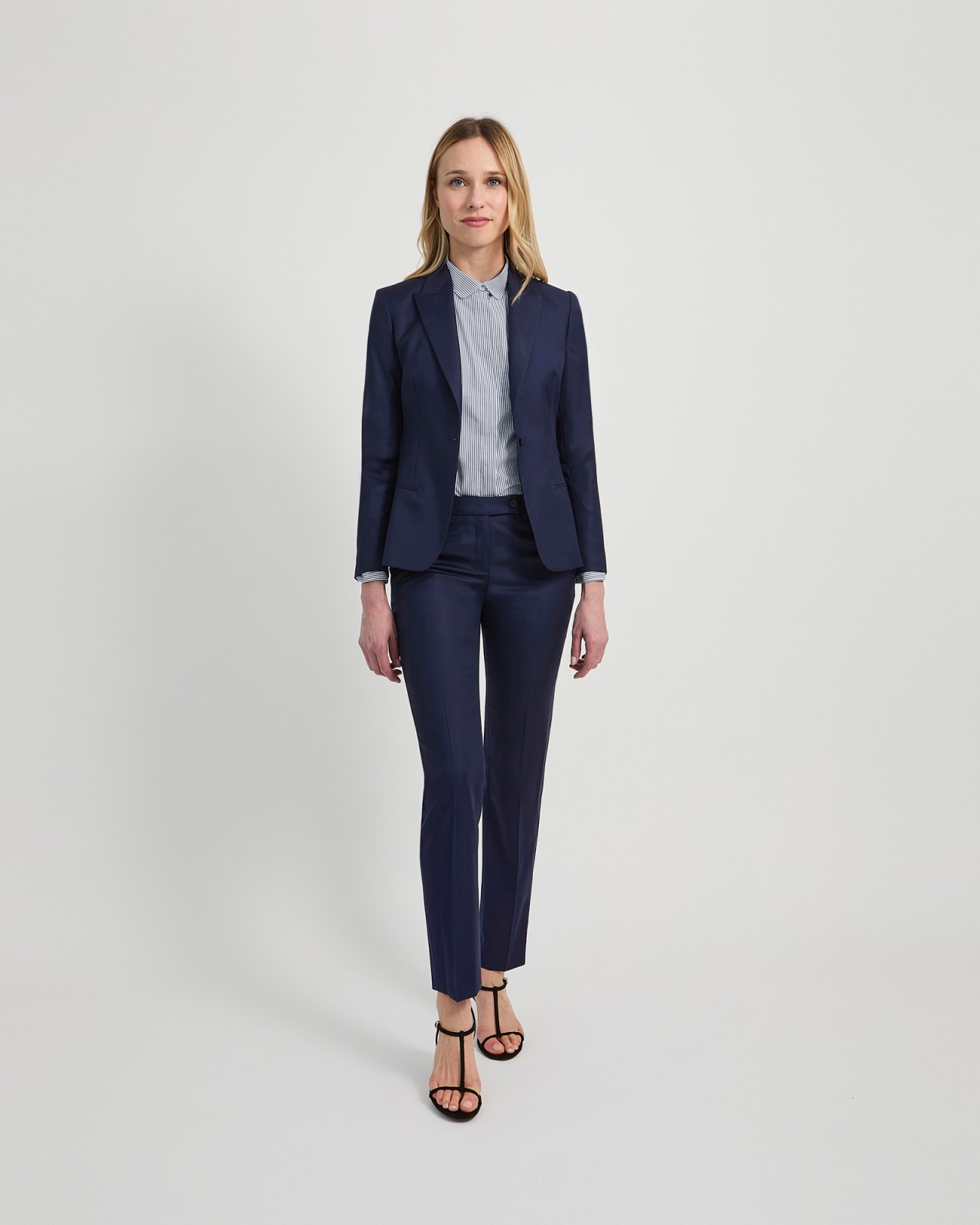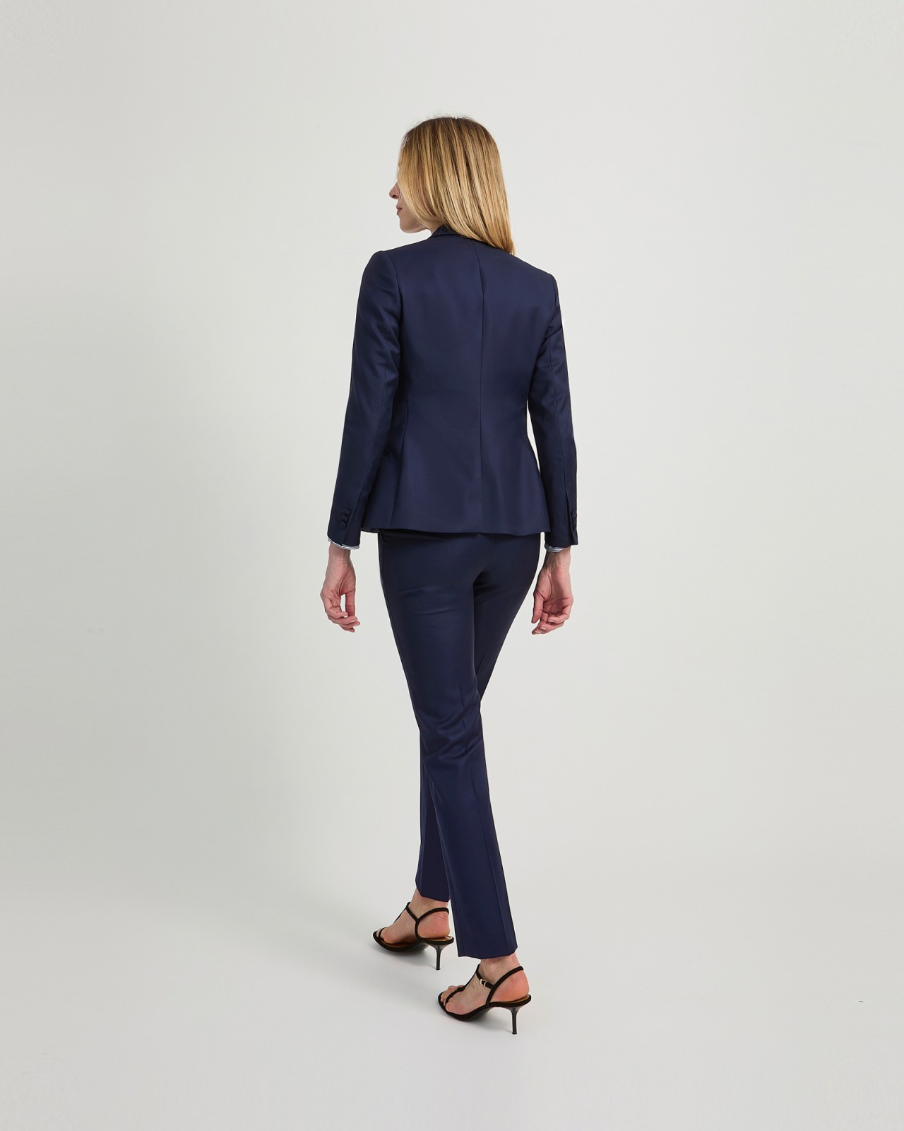 Pantalon coupe droite avec ceinture rapportée. Fermeture éclair et bouton de ceinture. Deux poches cavalières devant et deux poches dos passepoilées. Plis de repassage devant.