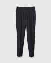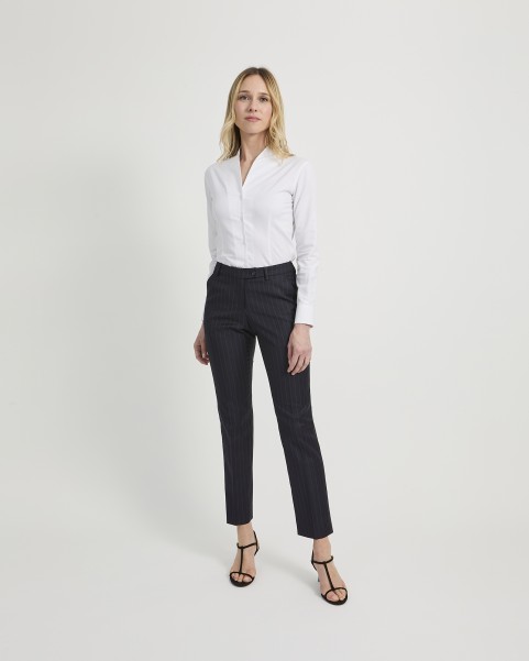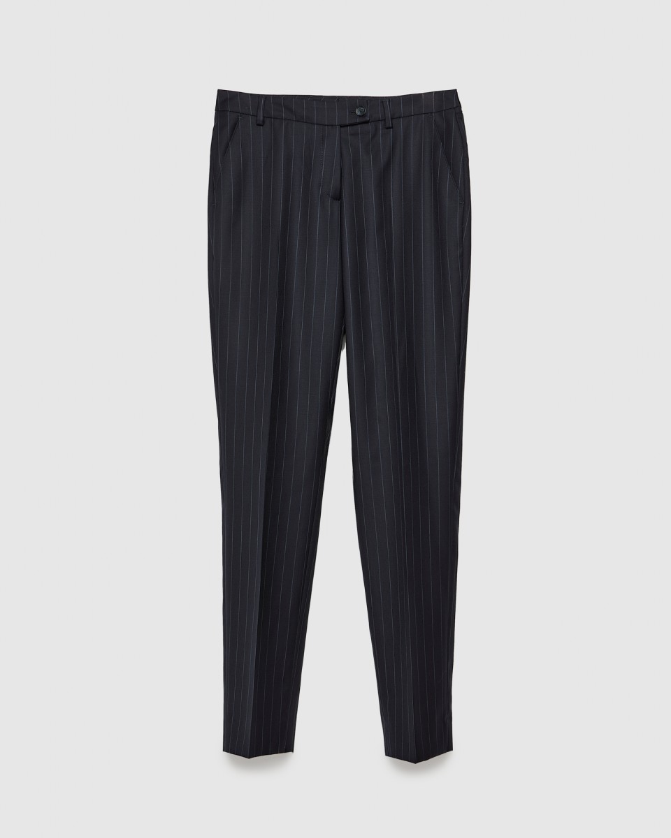 Pantalon coupe droite à motif rayé avec ceinture rapportée. Fermeture éclair et bouton de ceinture. Deux poches cavalières devant et deux poches dos passepoilées. Plis de repassage devant.