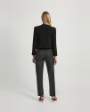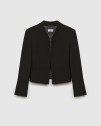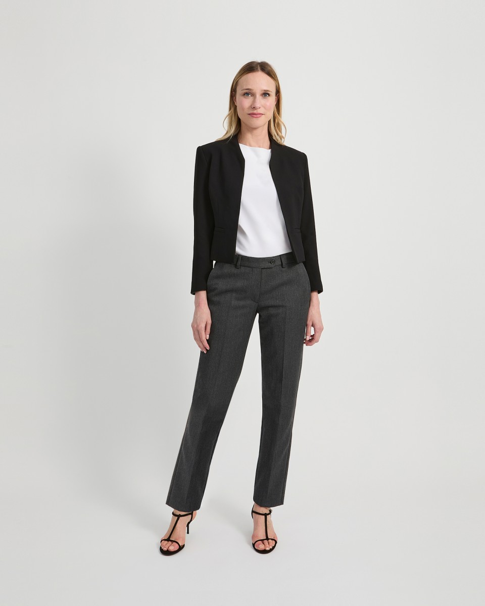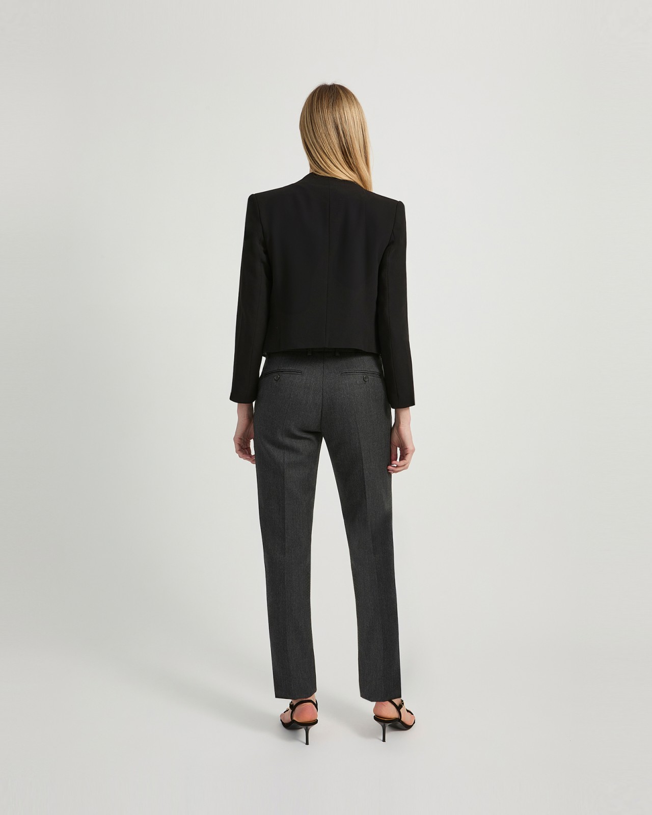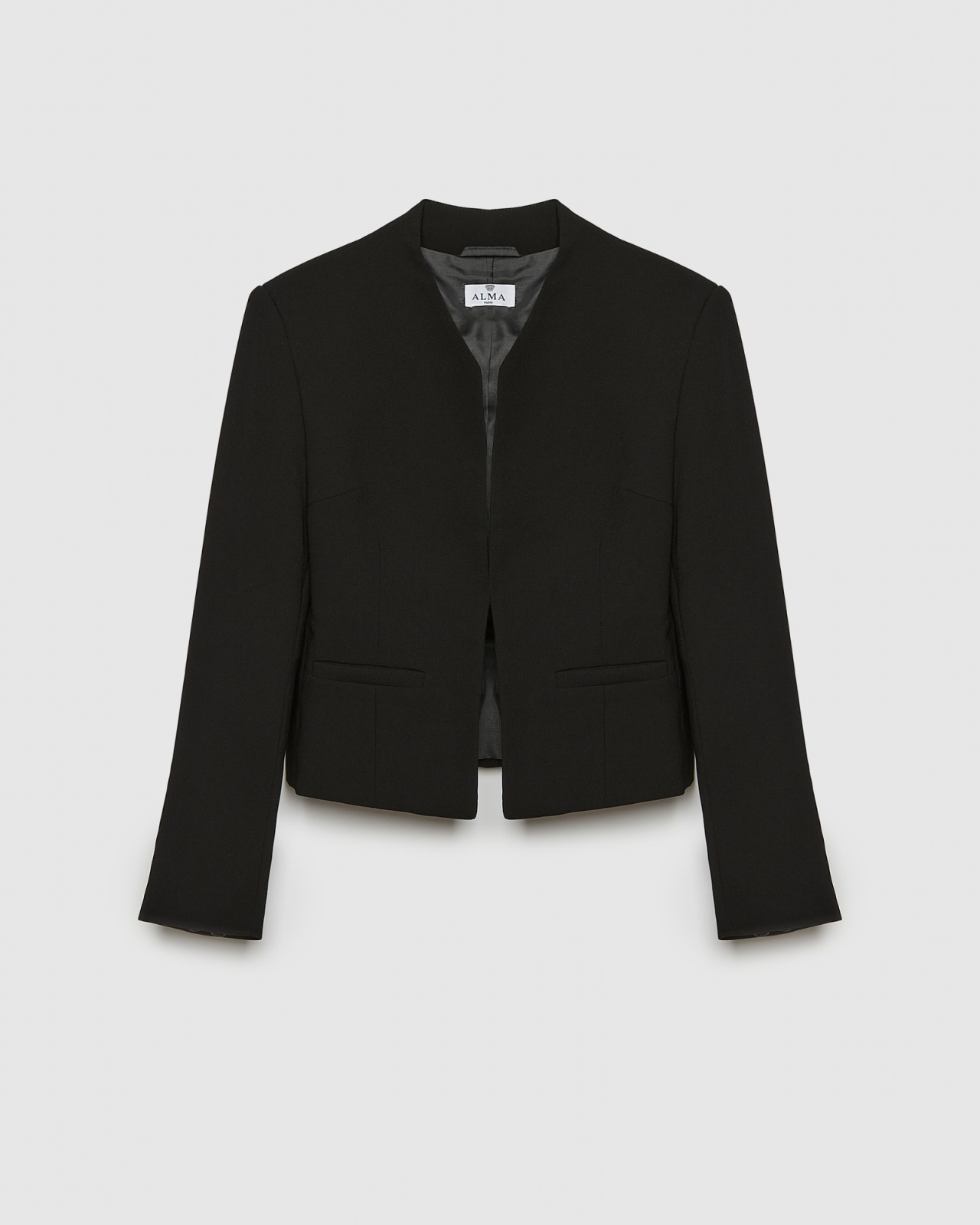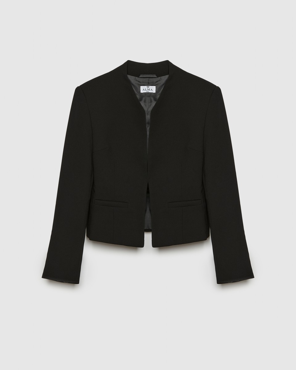 Veste doublée courte. Fermeture par une agrafe. Deux fausses poches à simple rabat. Pinces devant, pas de fente dos.