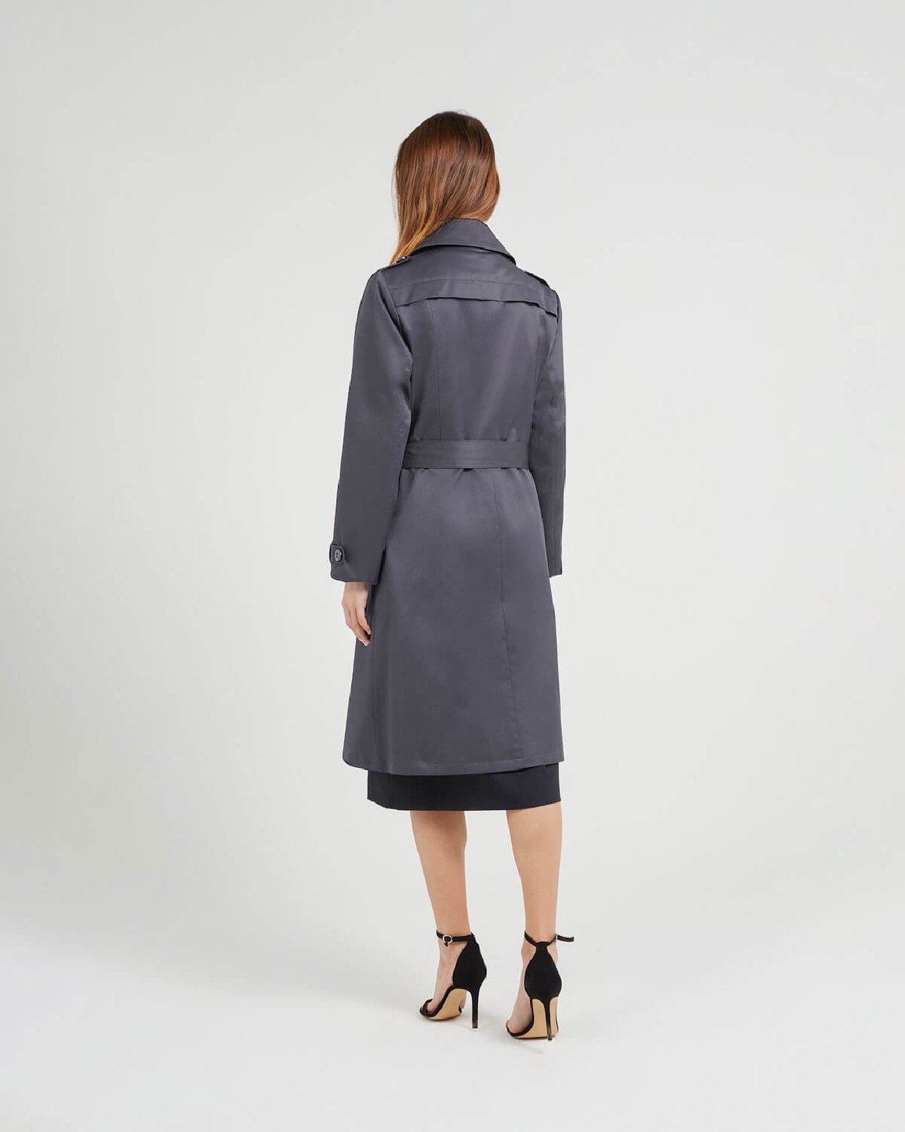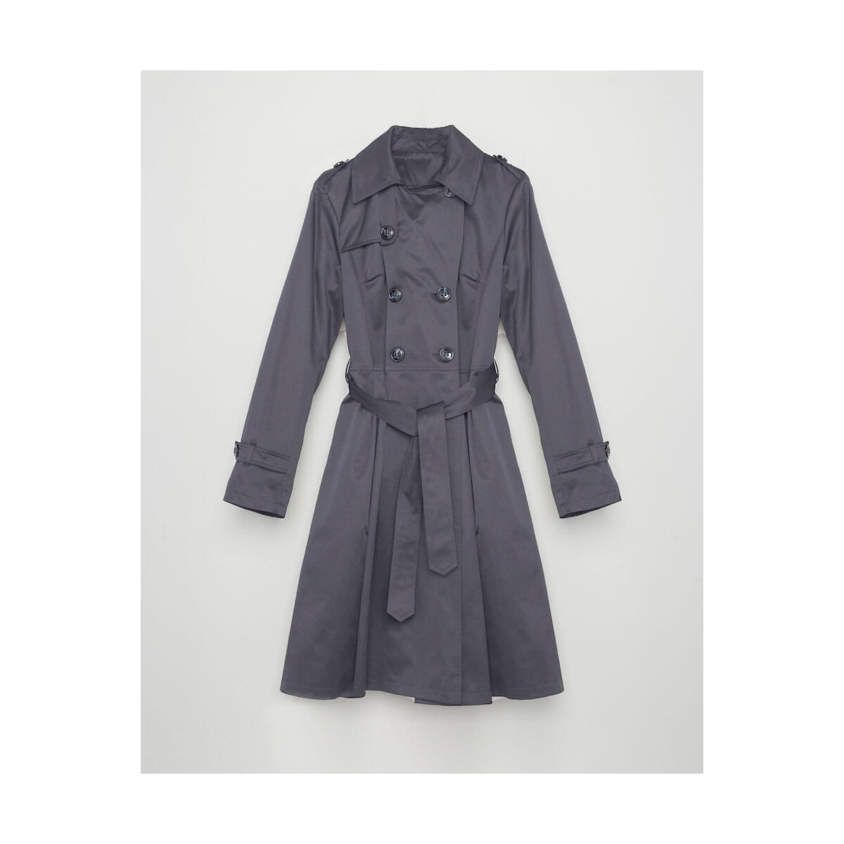 Trench long doublé. Fermeture par x boutons. Deux poches à revers. Basque avec découpe à la taille.