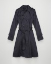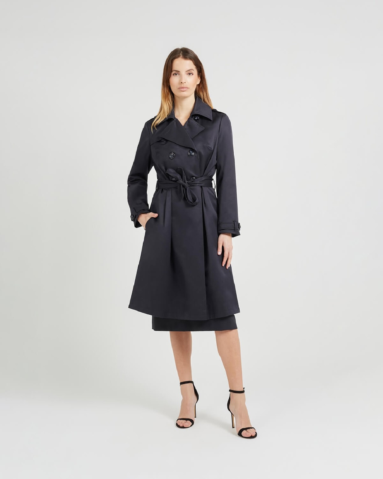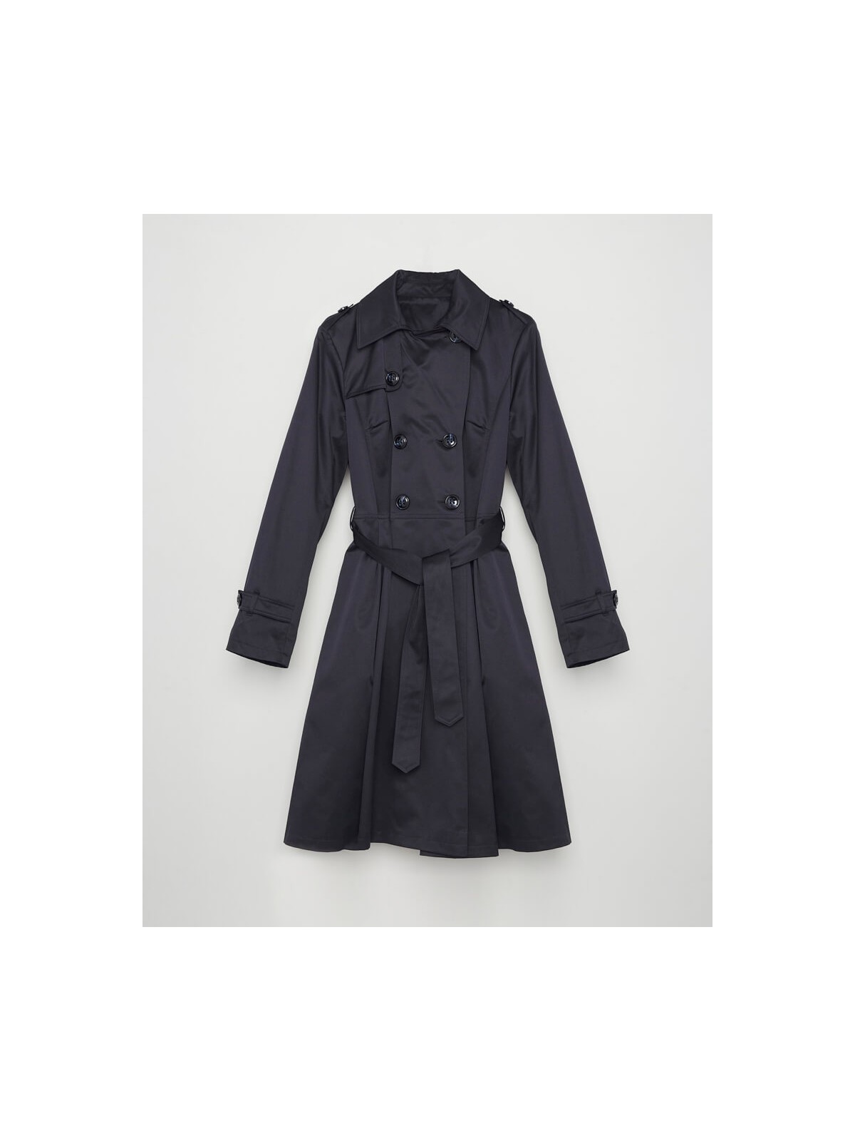Trench long doublé. Fermeture par x boutons. Deux poches à revers. Basque avec découpe à la taille.