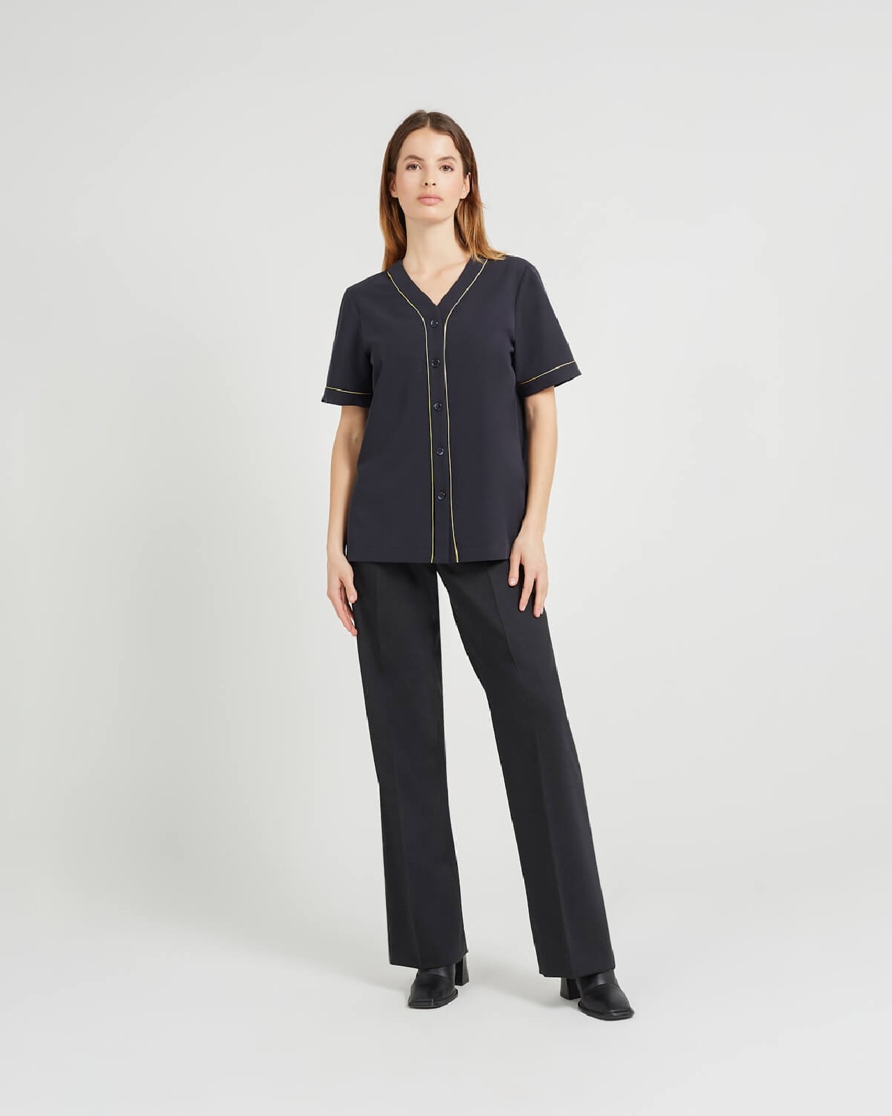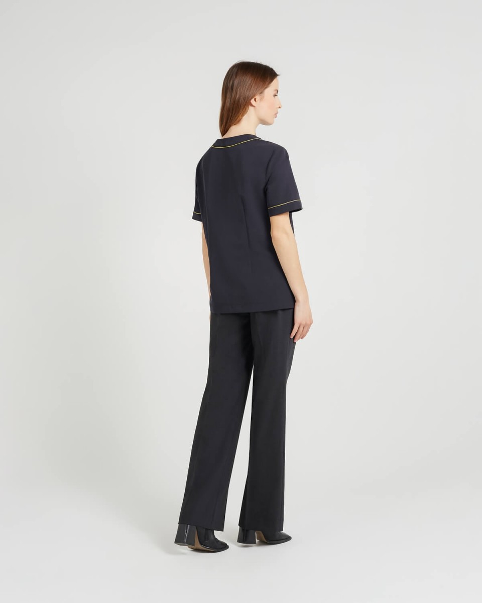 Pantalon évasé. Fermeture élair et bouton sur le côté. Passant pour la ceinture.
