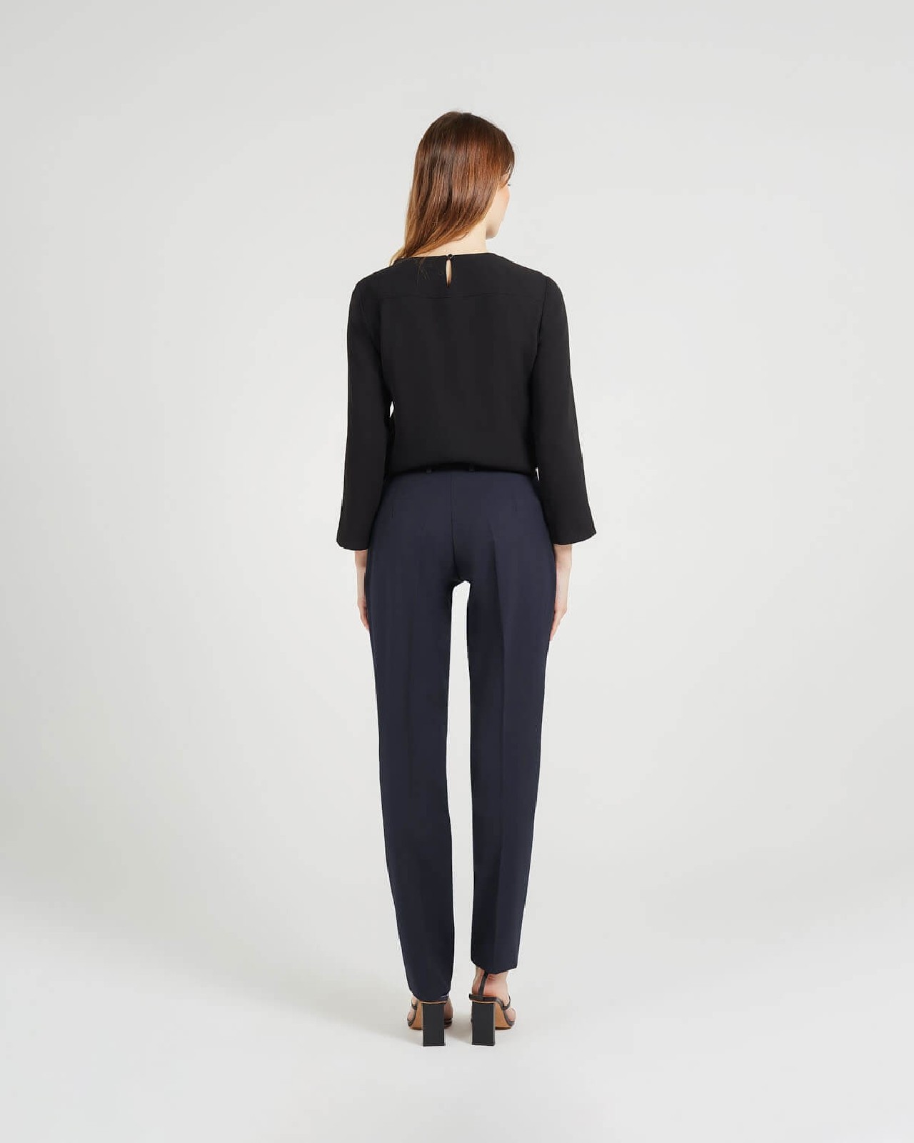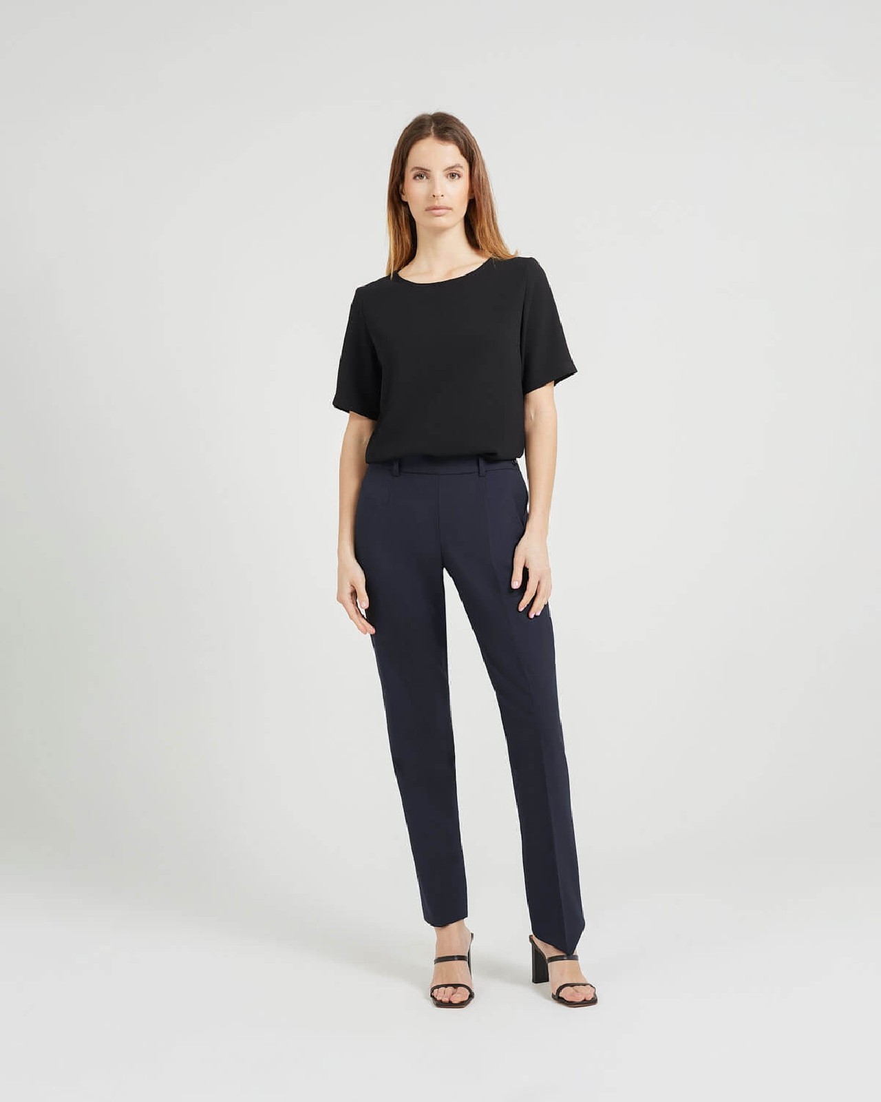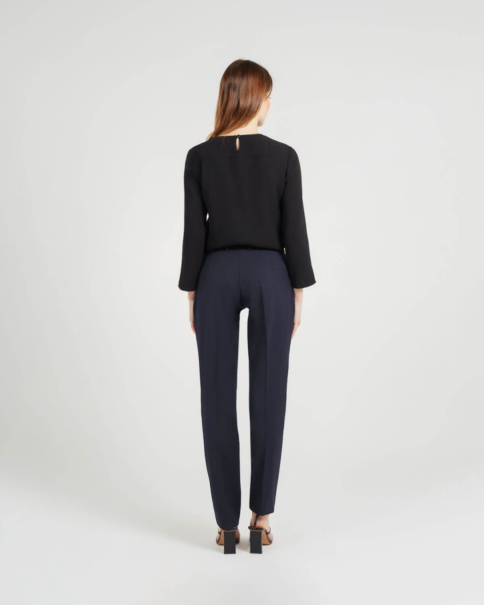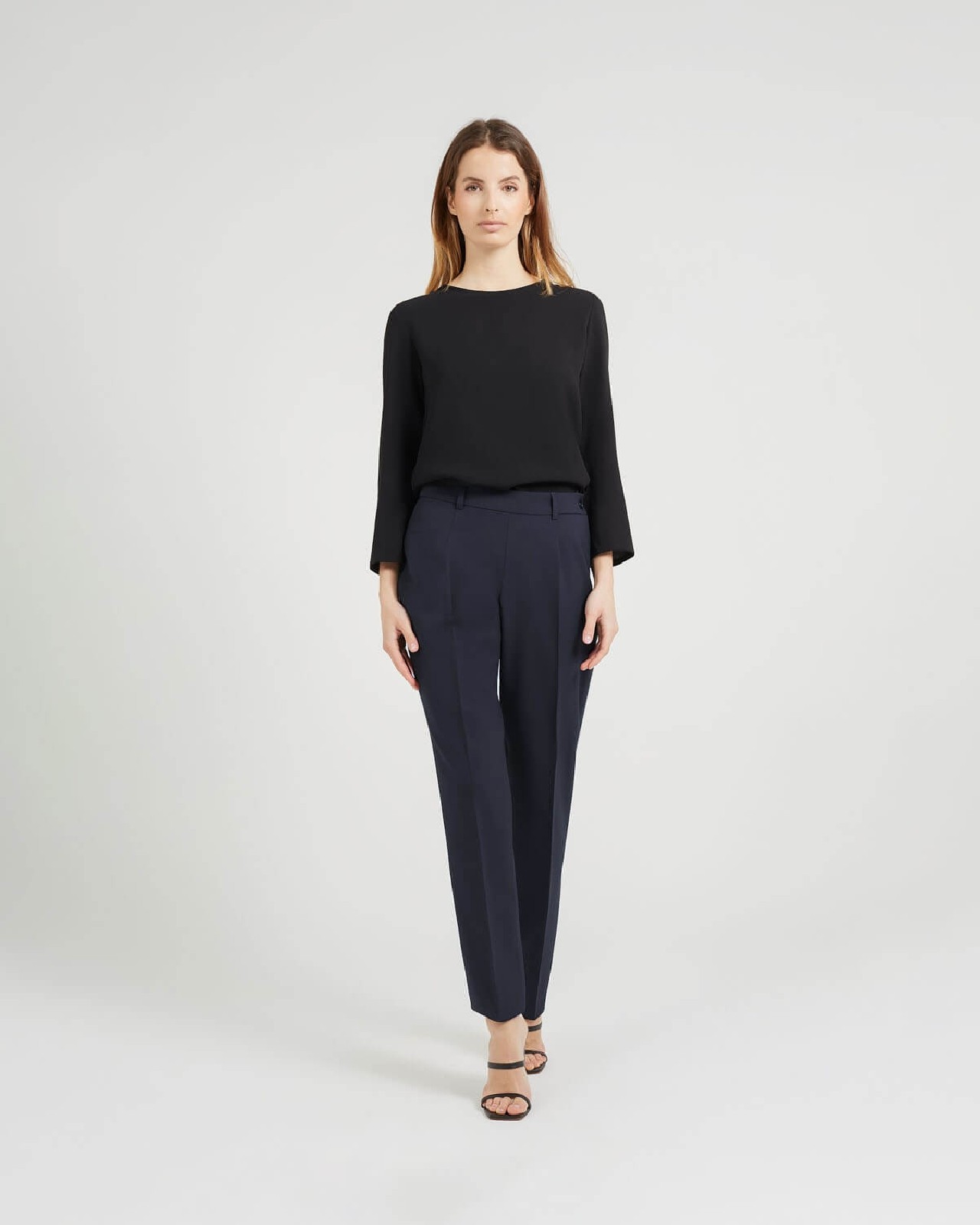 Pantalon droit. Fermeture éclair et bouton sur le côté. Passants pour ceinture.