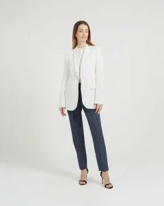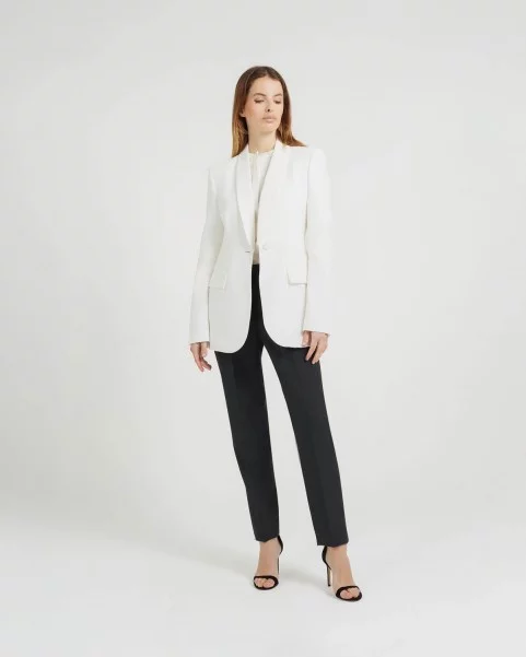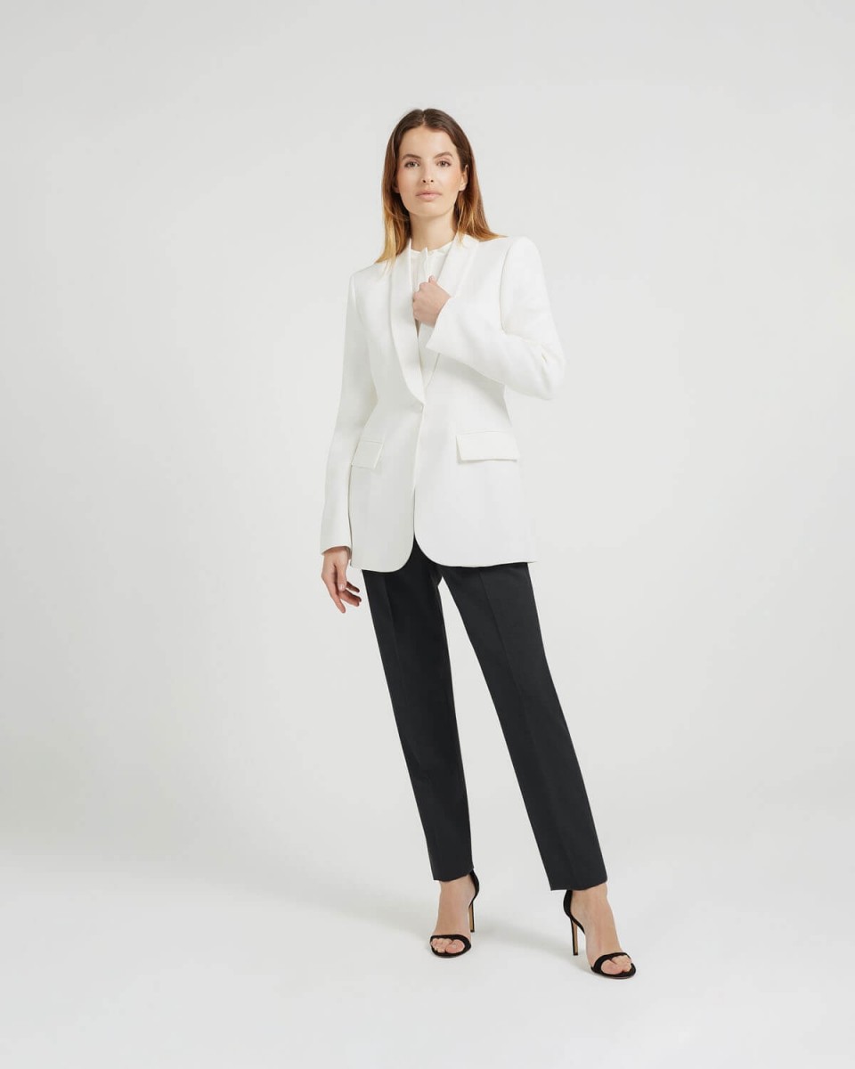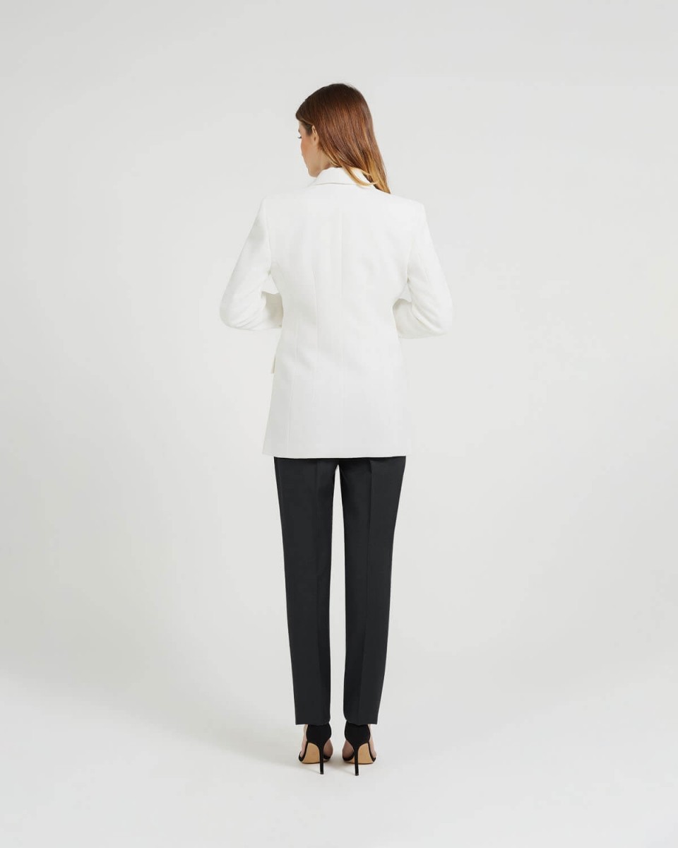 Pantalon droit. Fermeture éclair et bouton sur le côté. Passants pour ceinture. Jambes demi-doublées.