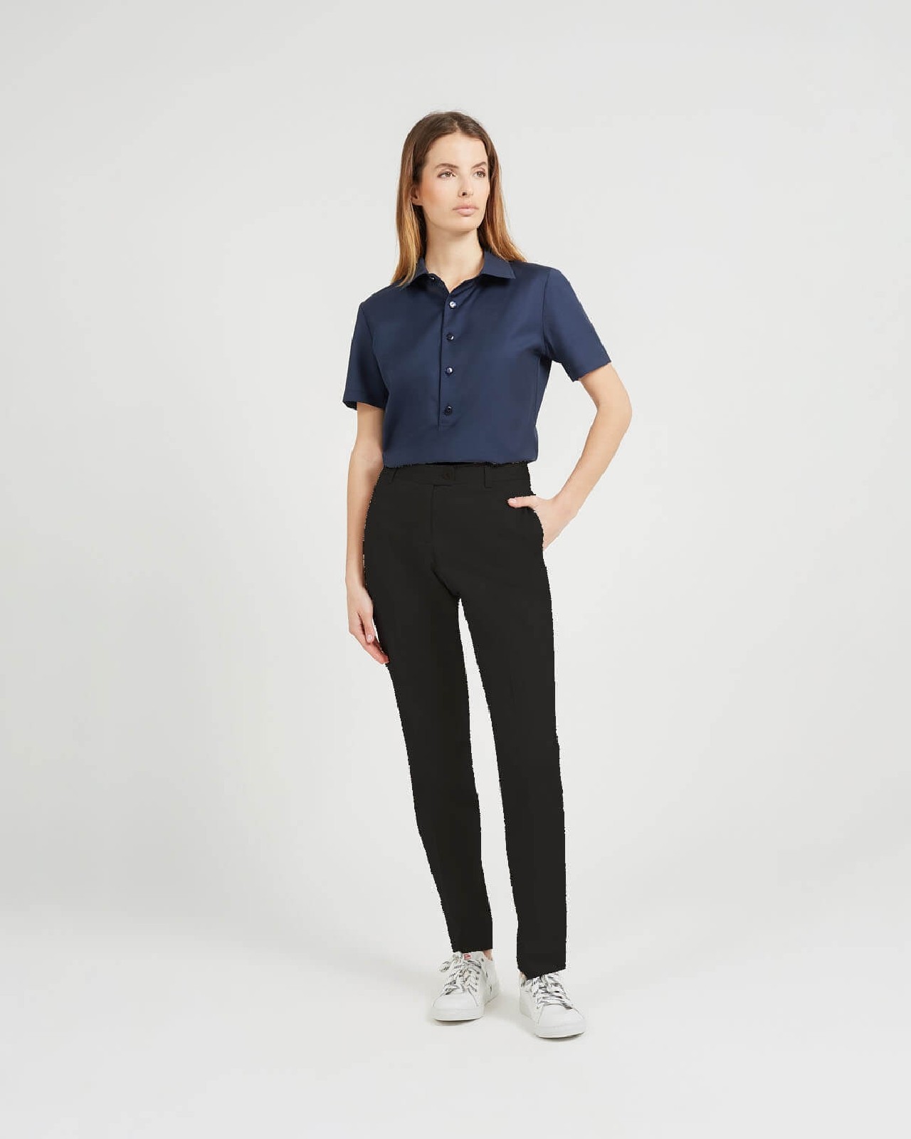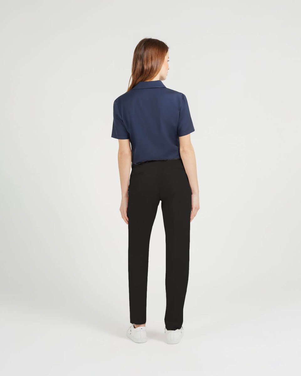Pantalon chino. Fermeture éclair et bouton. Passants pour ceinture. Deux poches italiennes et deux poches passepoilées sur l'arrière.