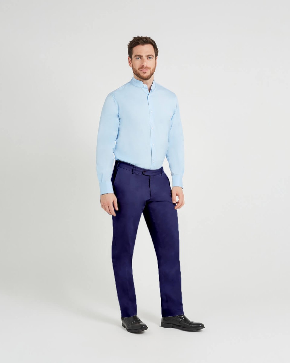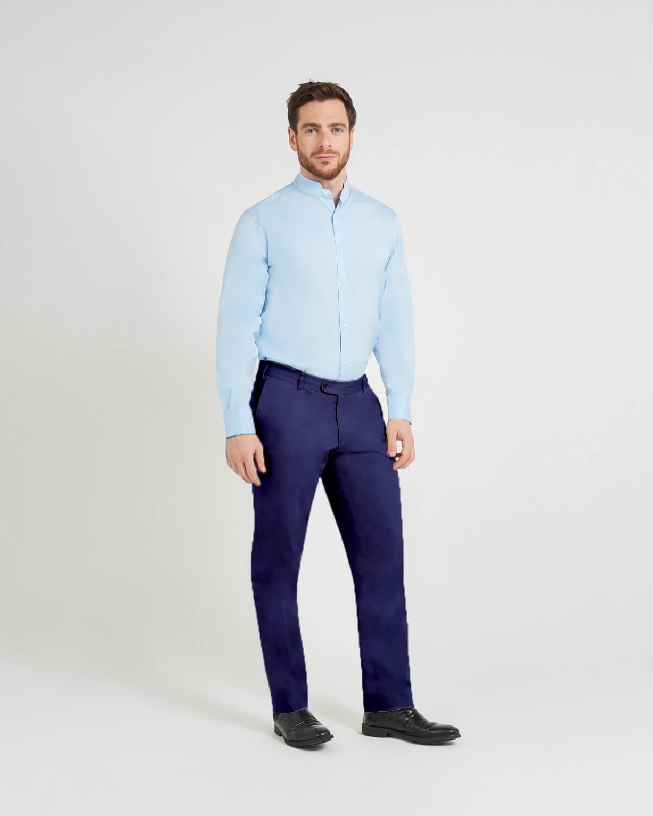 Pantalon chino avec fermeture par zip et bouton. Deux poches italiennes sur le devant et deux poche passepoilées avec bouton dos. Passants pour ceinture.