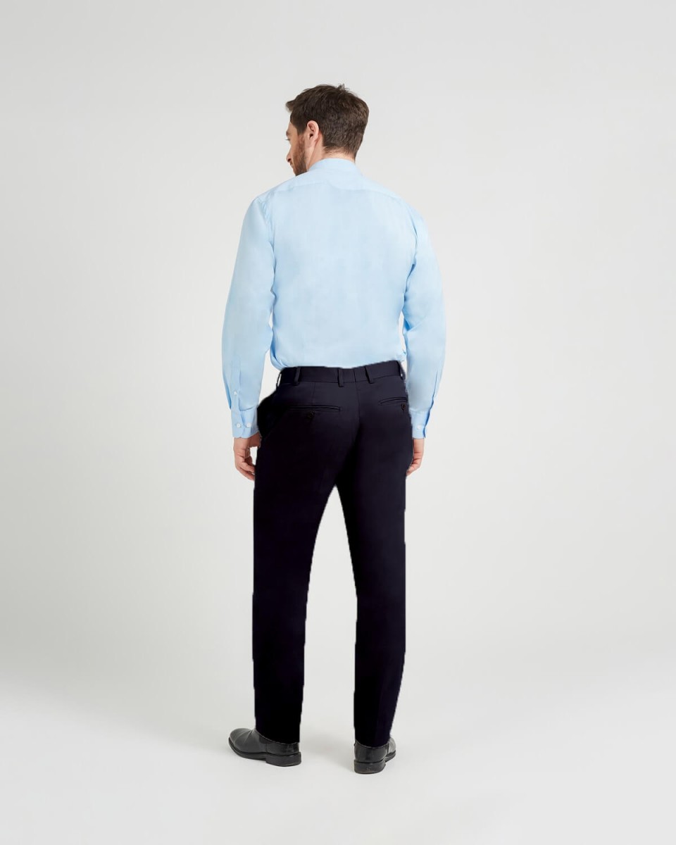 Pantalon chino avec fermeture par zip et bouton. Deux poches italiennes sur le devant et deux poche passepoilées avec bouton dos. Passants pour ceinture.