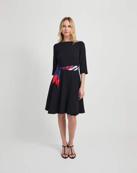 Robe doublée coupe évasée patineuse. Découpe à la ceinture avec des passants. Pinces sur le devant et dos. Couleur du piping au choix. Veuillez nous contacter pour toutes personnalisations de nos modèles.