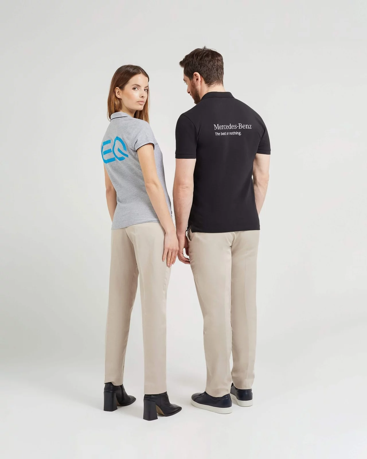 Polo à manches courtes brodé. Broderie sur poitrine et dans le dos. Fermeture par trois boutons. Disponible en manches longues. Broderie sur demande.