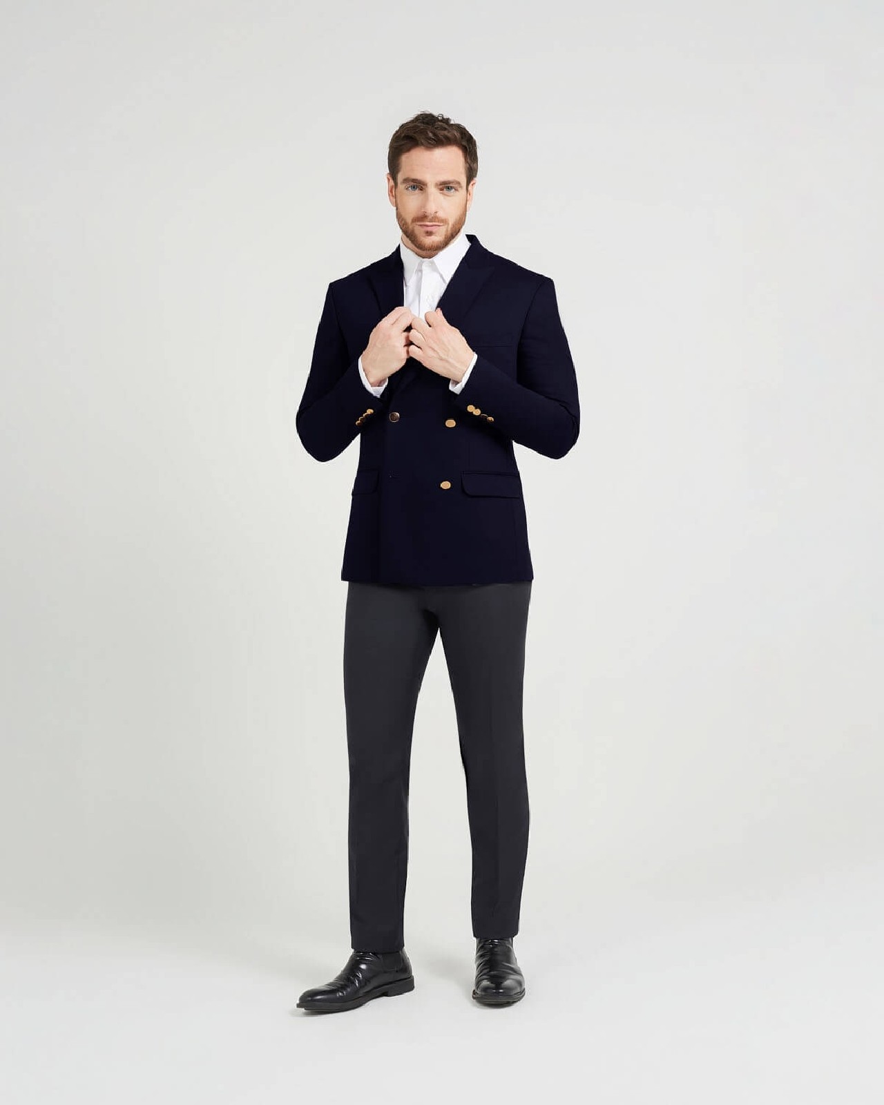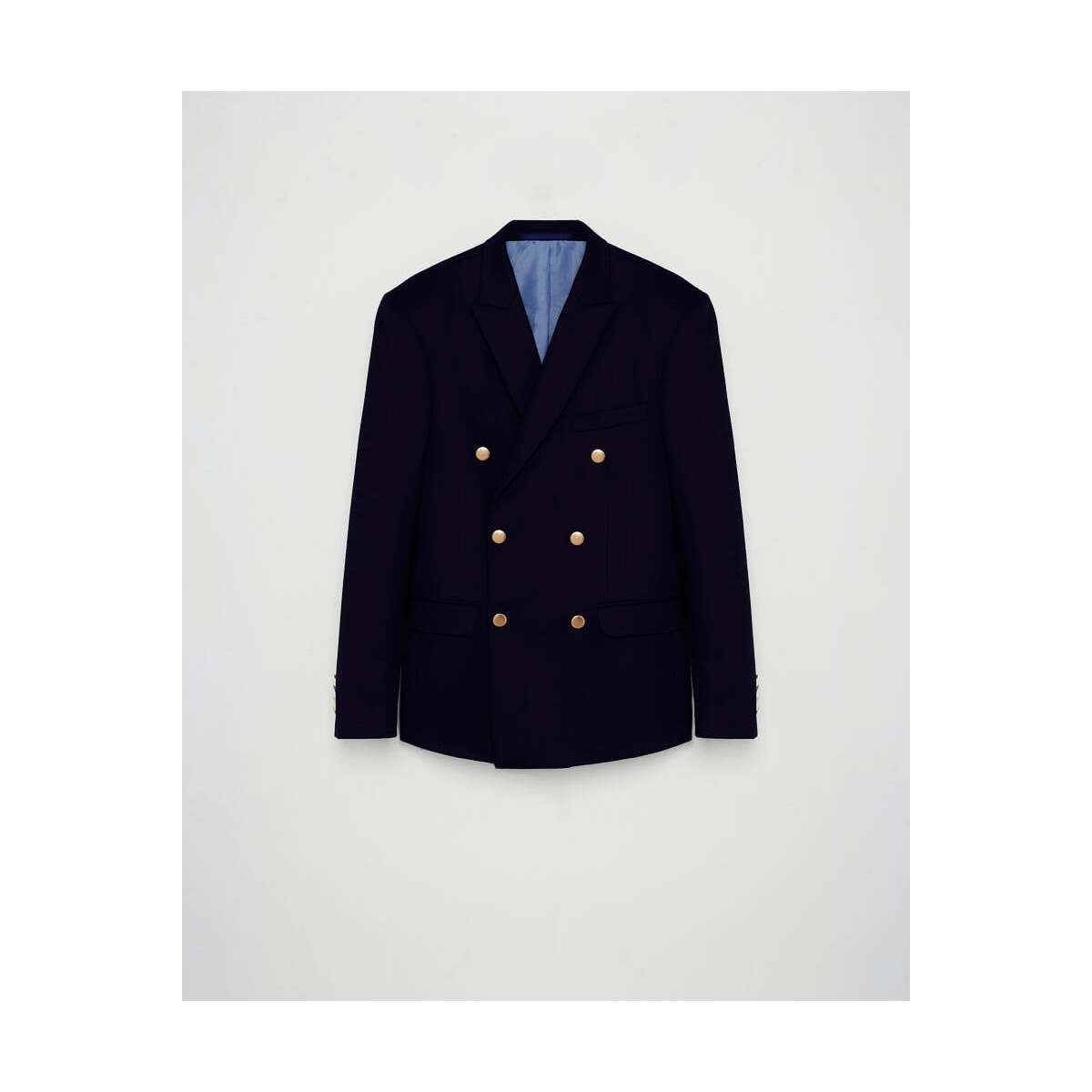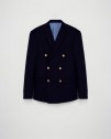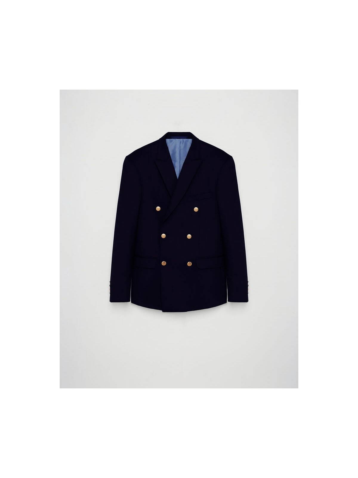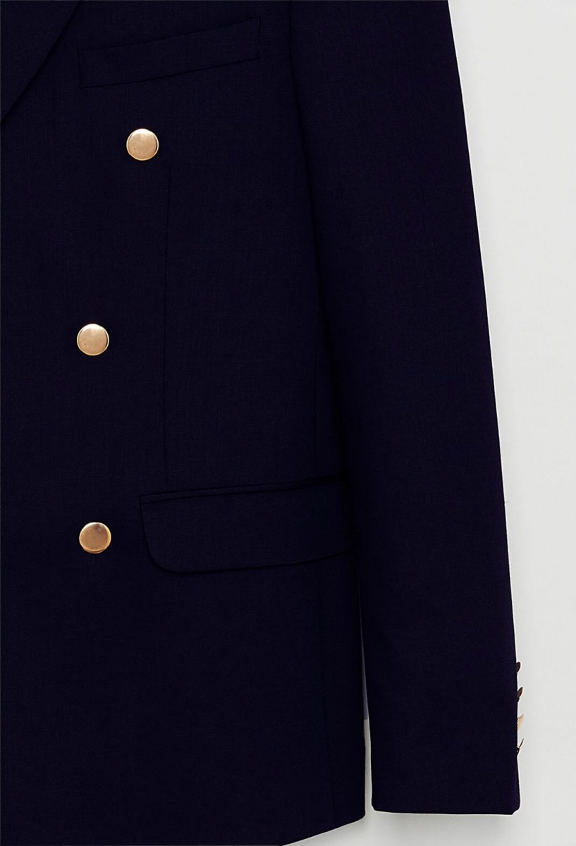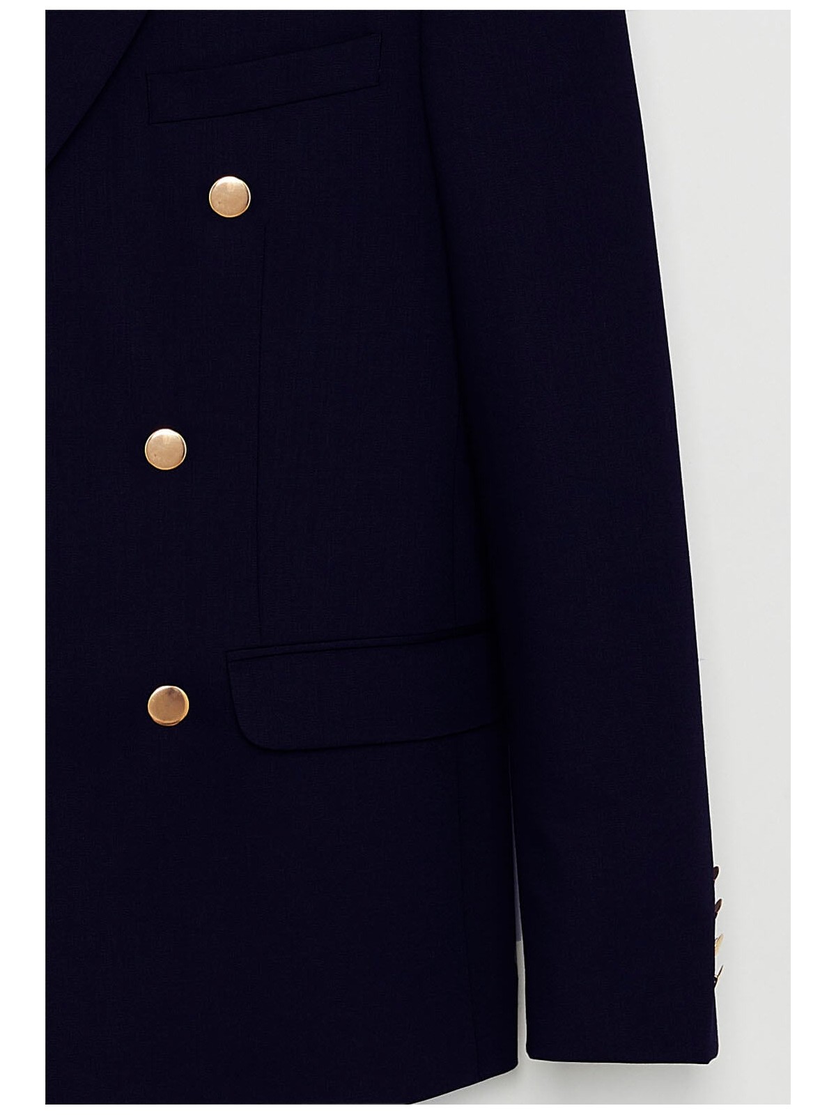Blazer croisé double a col aiguille. Fermeture par boutons en metal doré. Deux poches rabats une poche gilet poitrine .Pinces devant et dos. Fentes au dos.