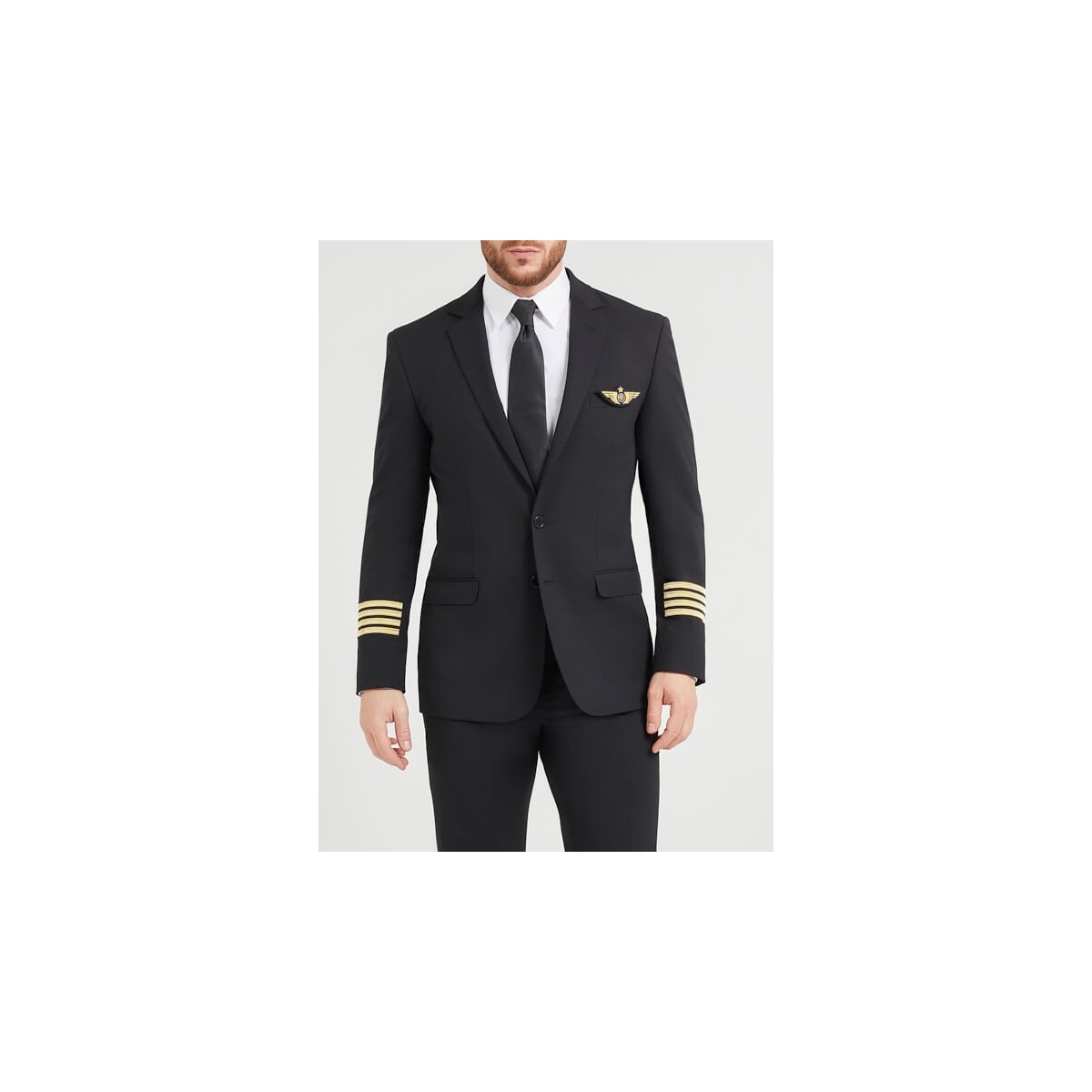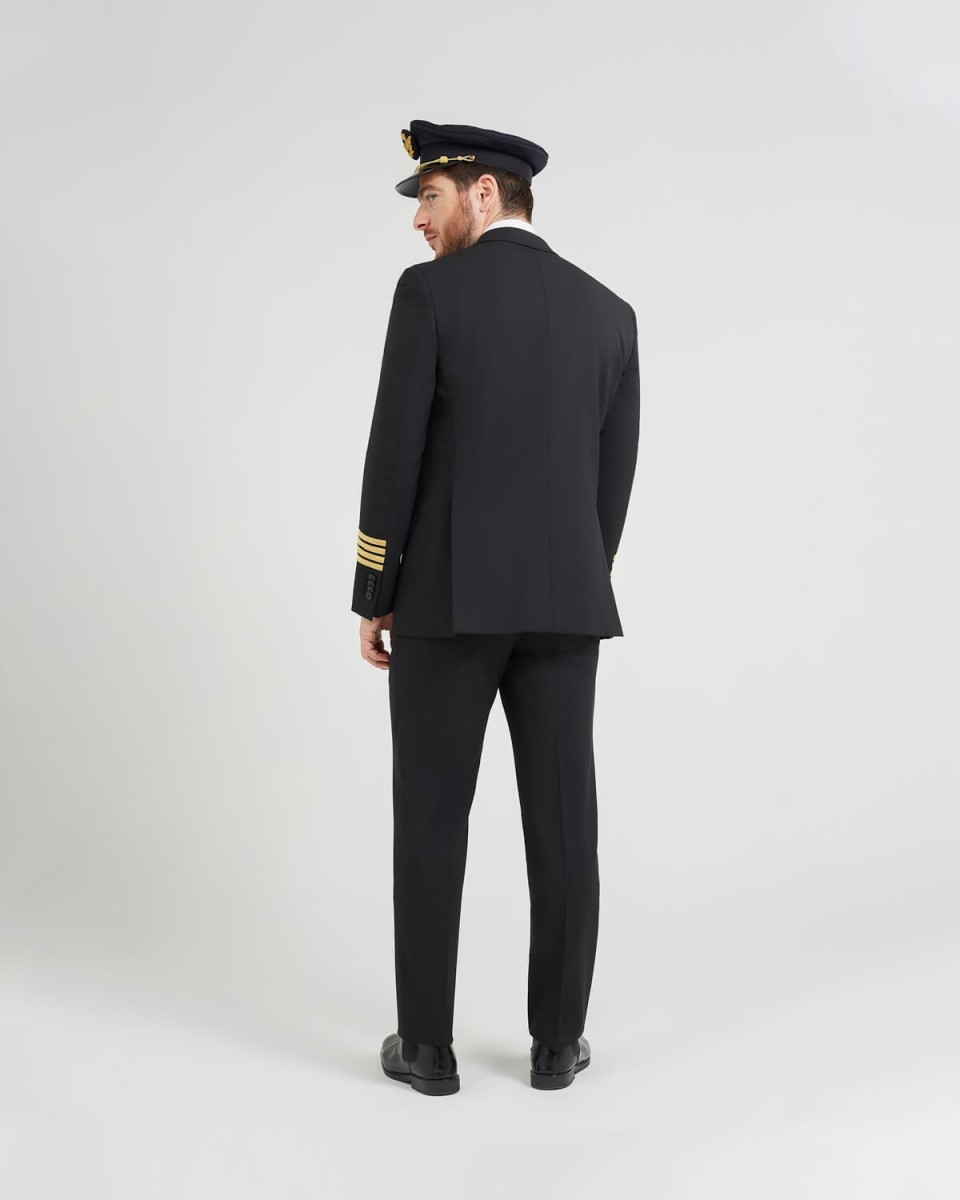 Veste doublée à col tailleur. Fermeture par deux boutons. Galon ddorés aux manches. Deux poches passepoilees et une poche gilet sur la poitrine. Pince devant et dos. Fentes au dos.