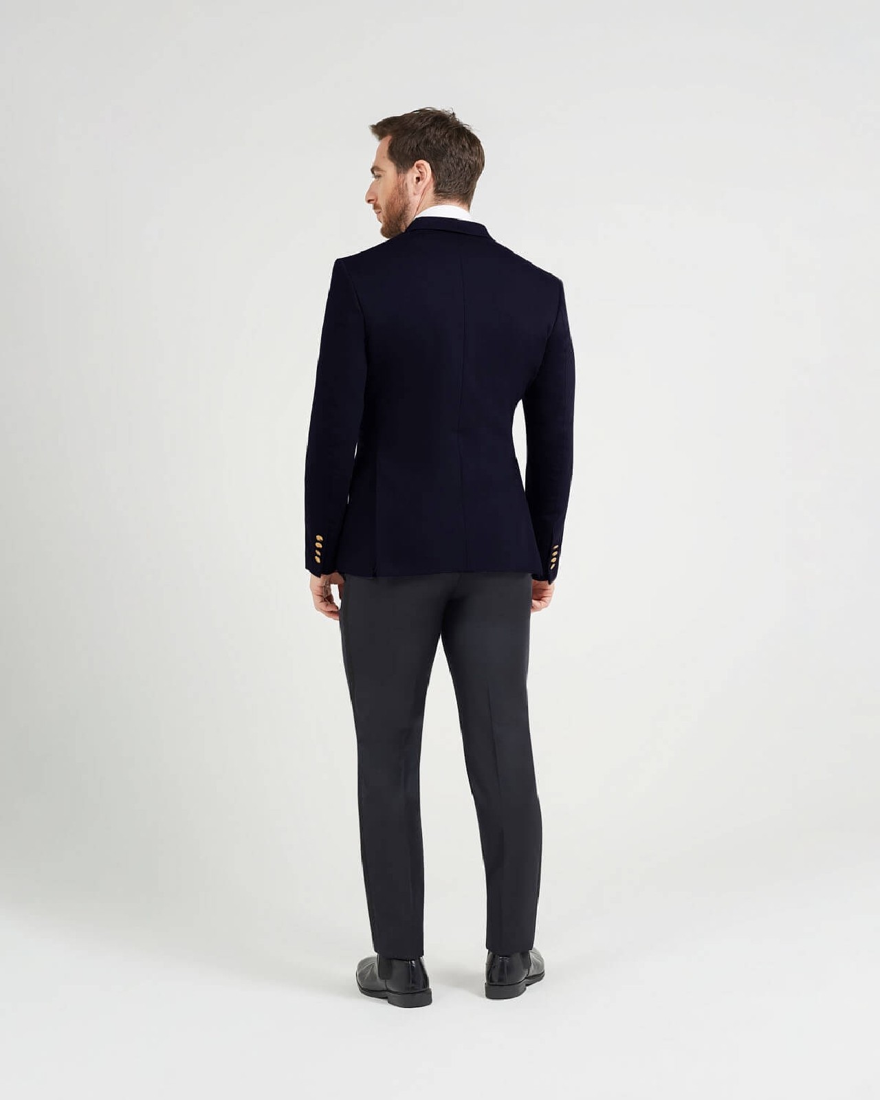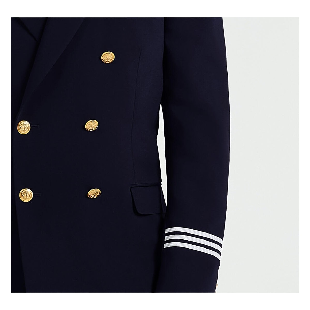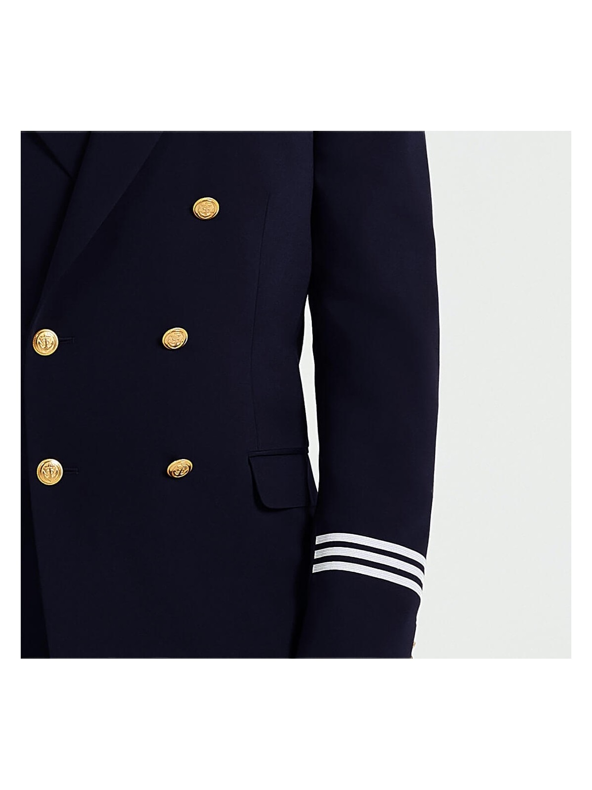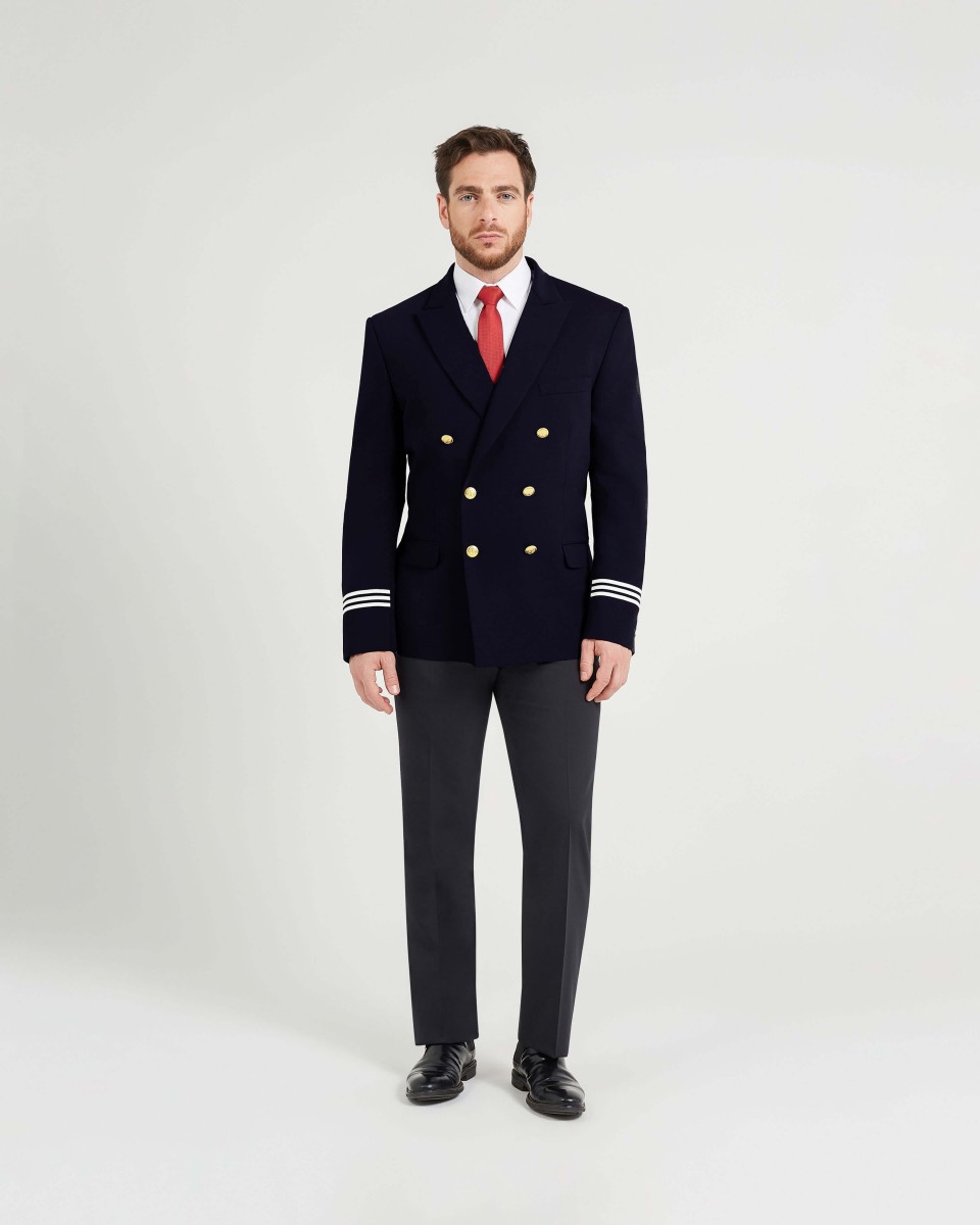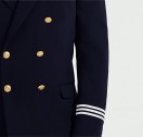 Blazer croisé doublé à col aiguille avec une fermeture par boutons dorés. Galons blancs aux manches. Deux poches à rabat et une poche gilet sur la poitrine. Pinces devant et dos fentes au dos.