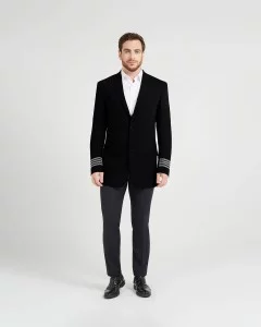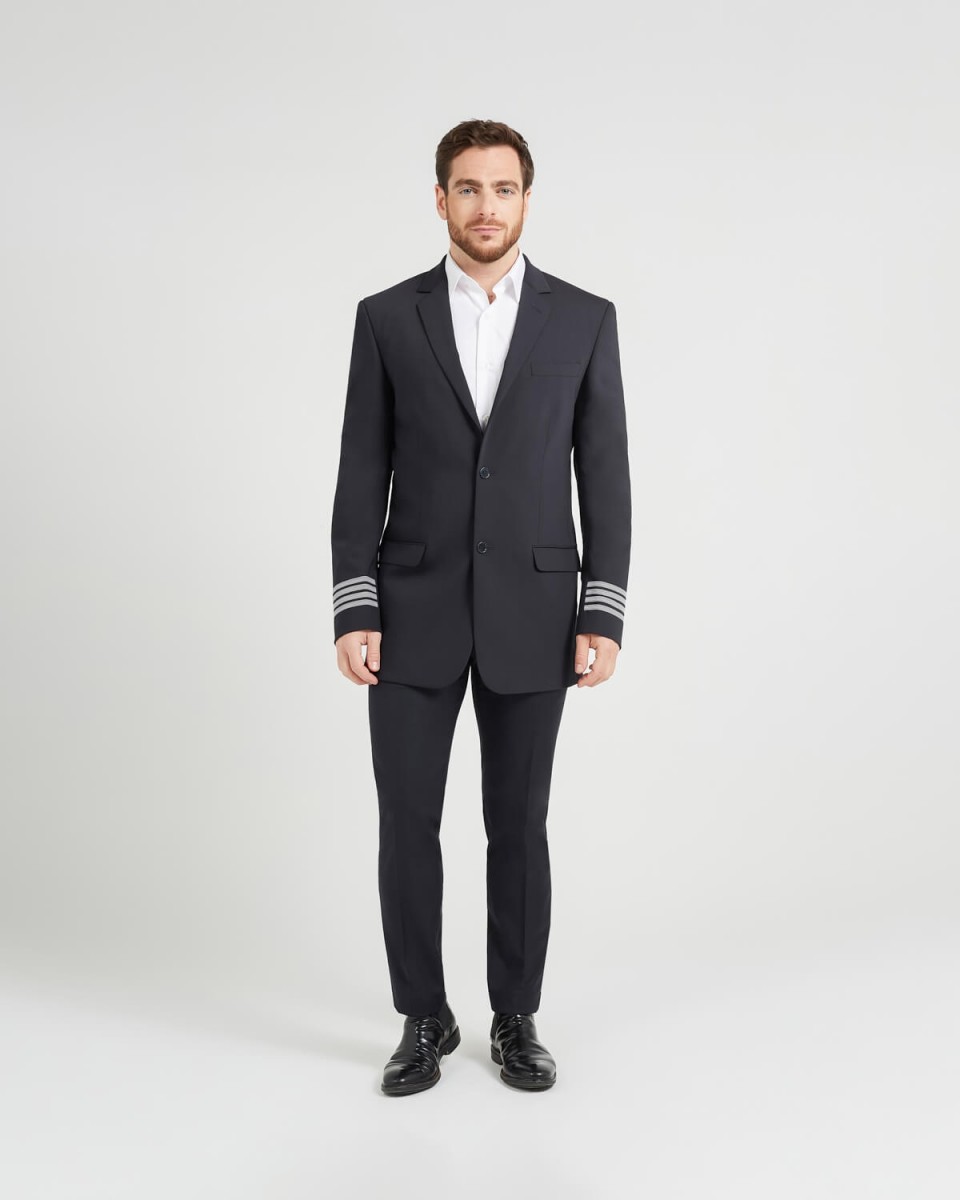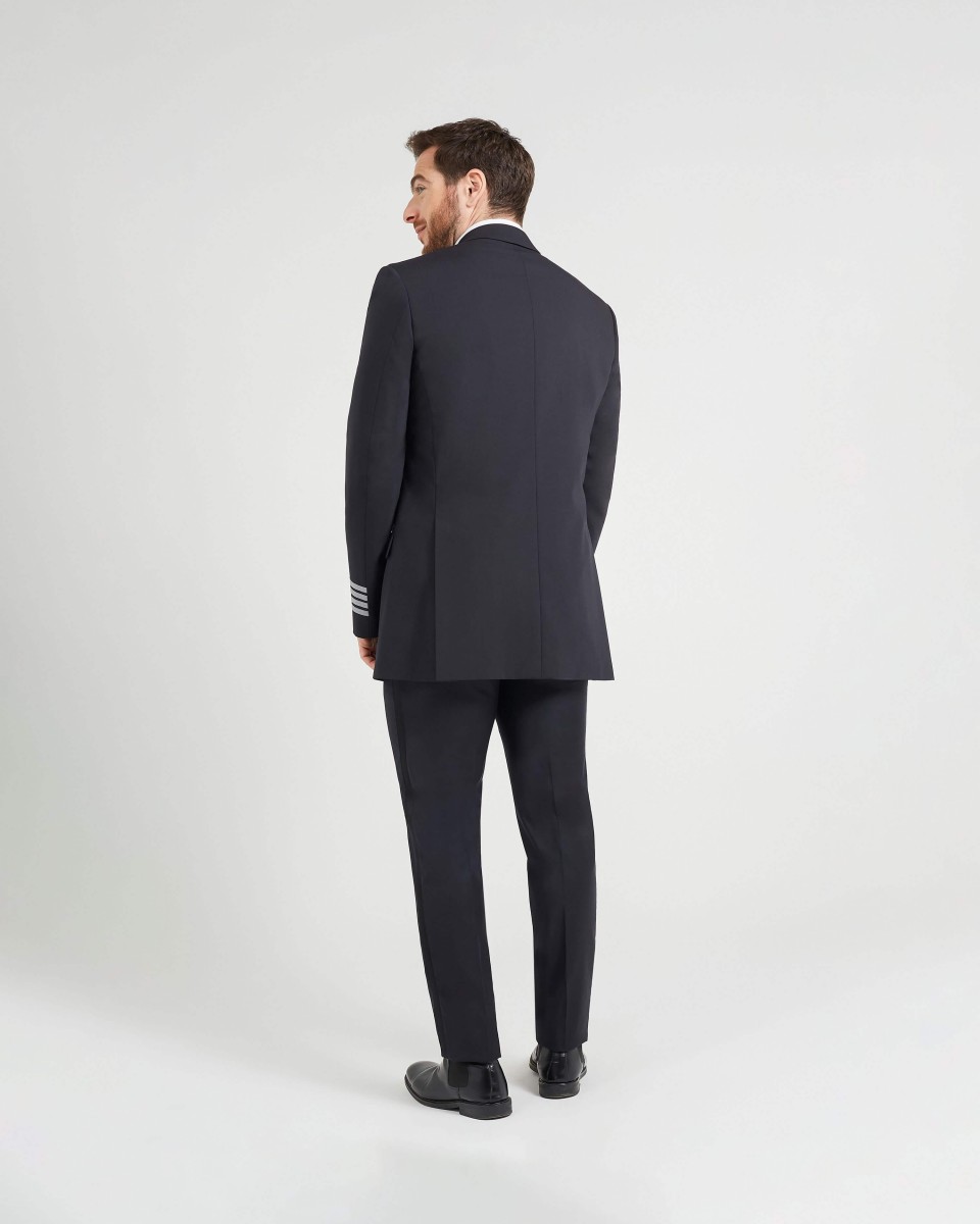 Blazer doublé à col classique. Fermeture par deux boutons. Galons gris mat aux manches. deux poches à rabat et une poche gilet sur la poitrine. Pinces devant et dos.