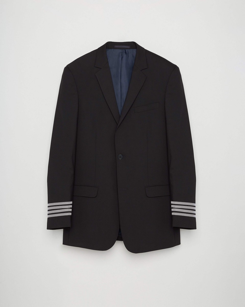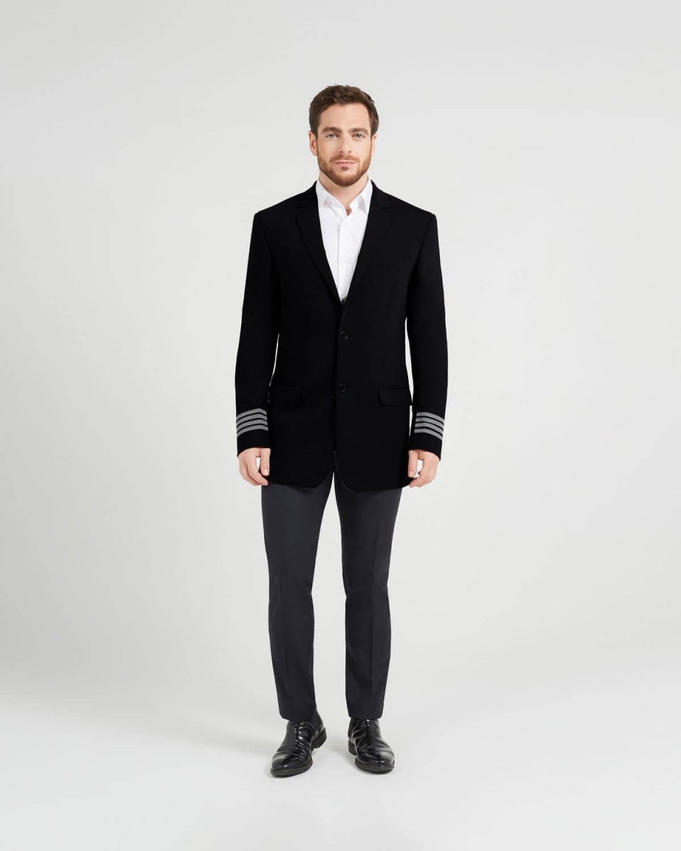 Blazer doublé à col classique. Fermeture par deux boutons. Galons gris mat aux manches. deux poches à rabat et une poche gilet sur la poitrine. Pinces devant et dos.