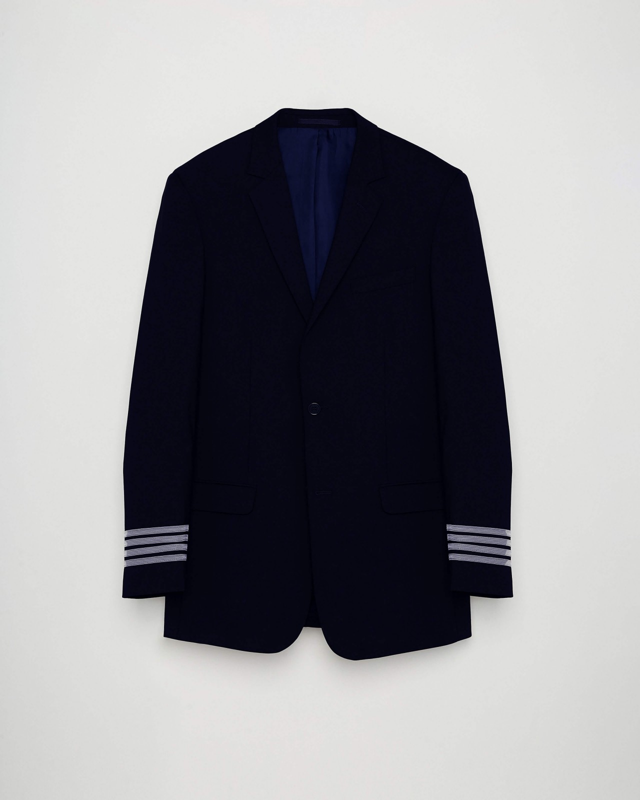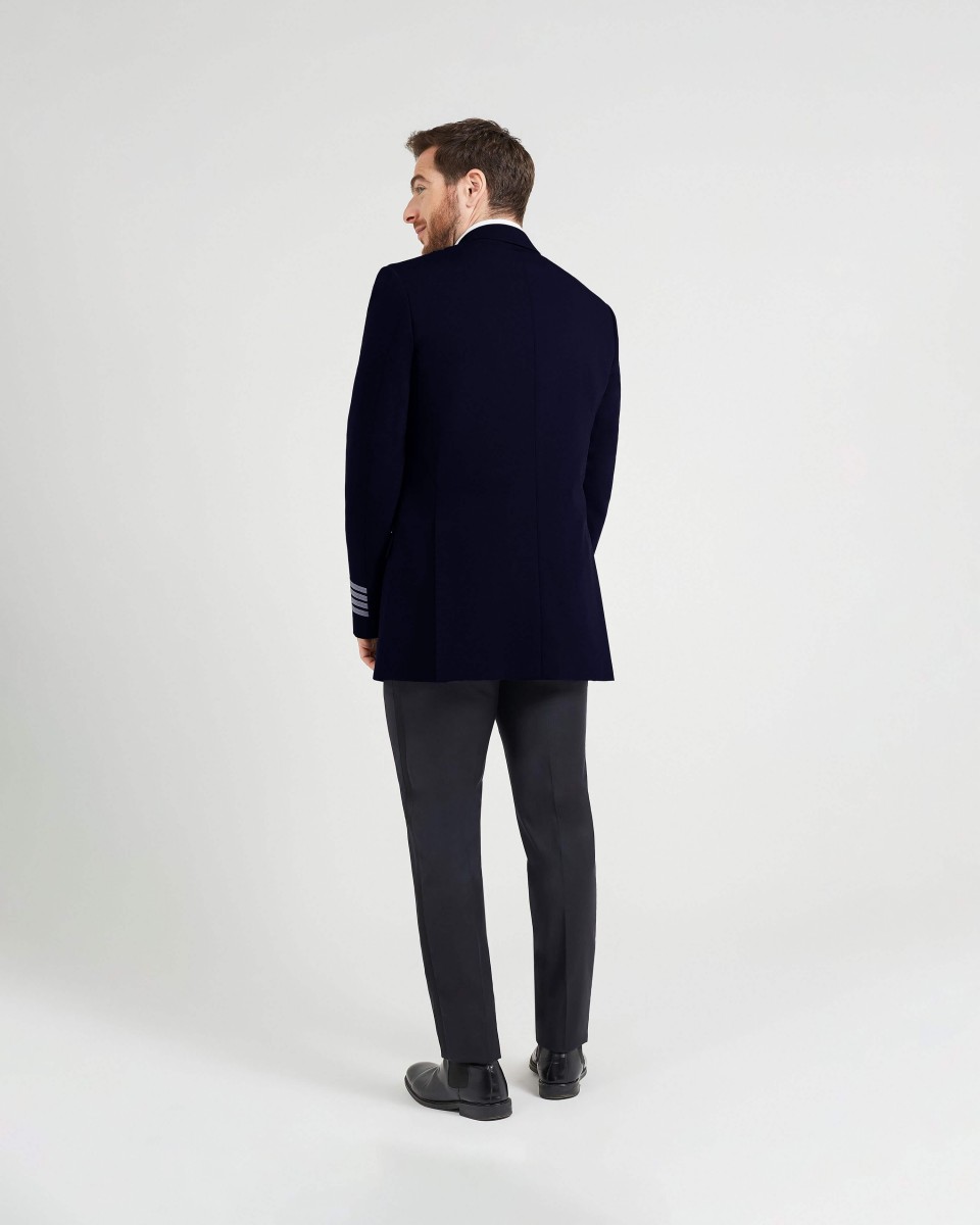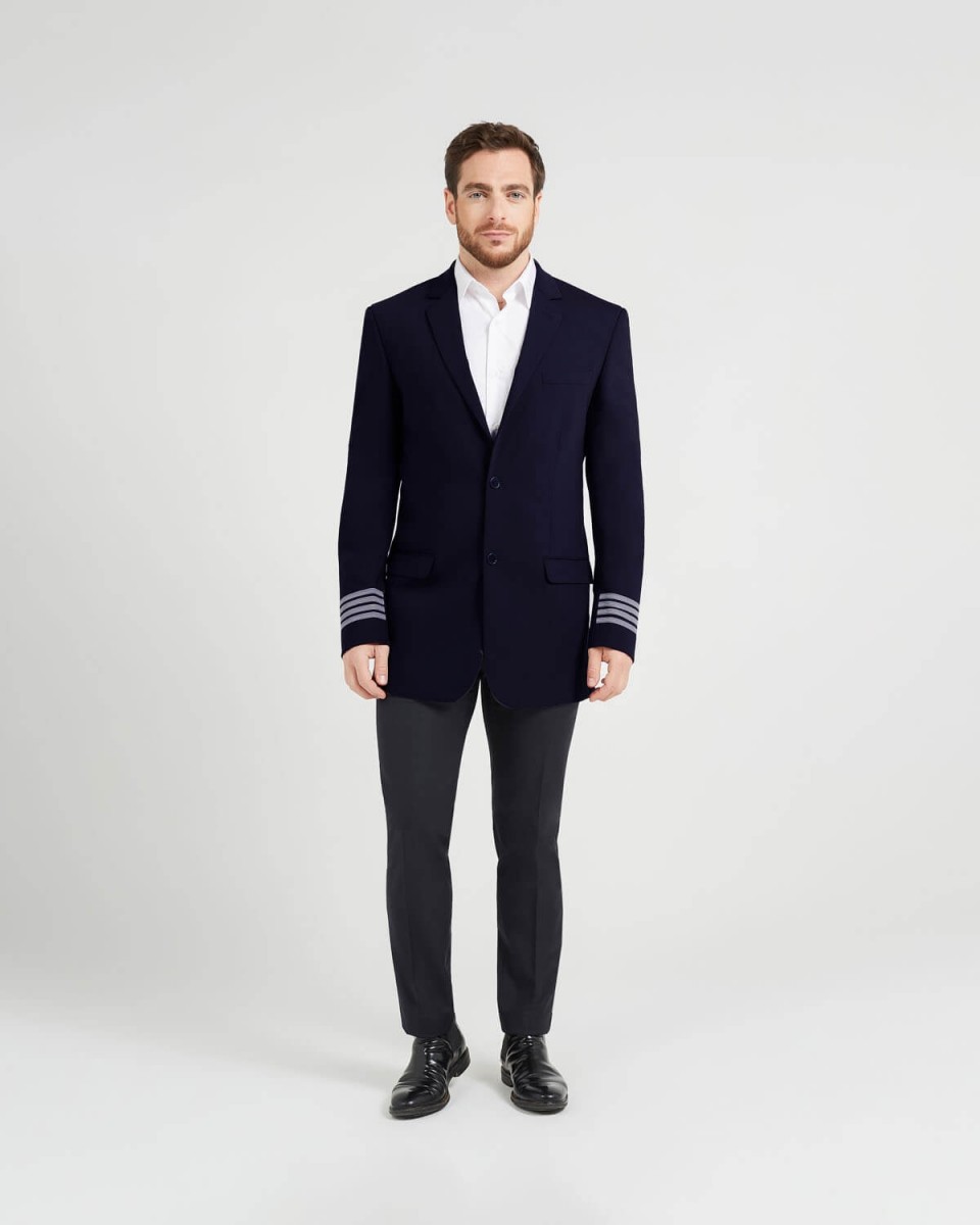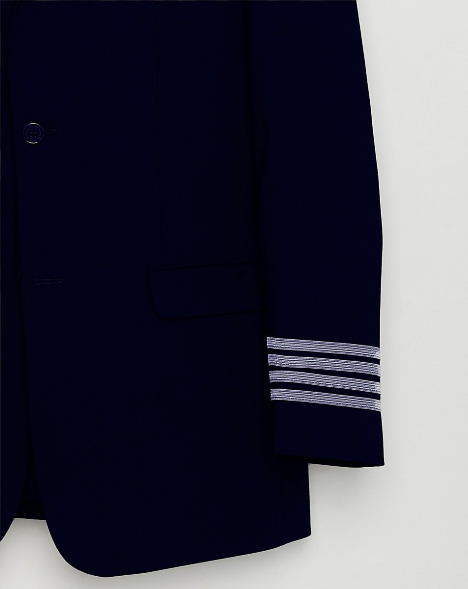 Blazer doublé à col classique. Fermeture par deux boutons. Galons gris mat aux manches. deux poches à rabat et une poche gilet sur la poitrine. Pinces devant et dos.