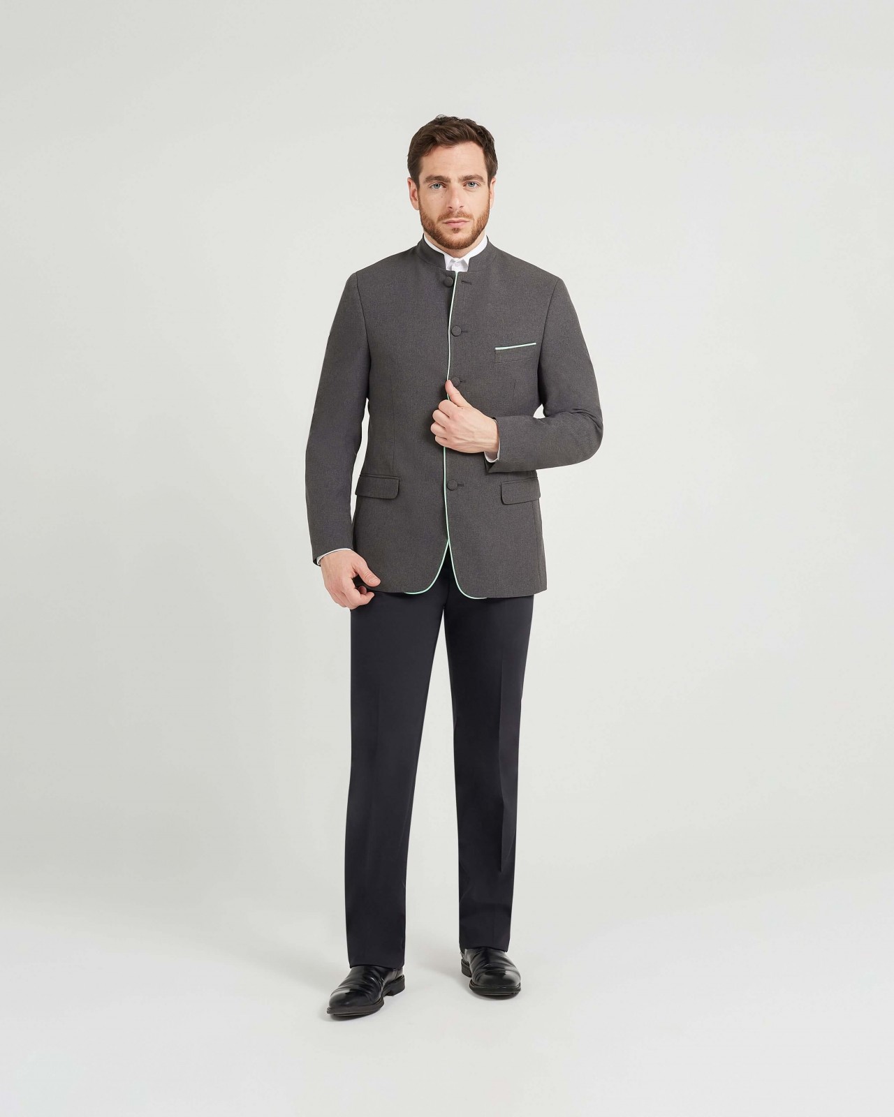 Veste doublée à col Mao. Fermeture par cinq boutons recouverts. Deux poches à rabat et une poche gilet sur la poitrine. Pinces devant et dos. Piping sur le bord de la veste et sur la poche poitrine. Coloris du piping au choix. Veuillez nous contacter pour toutes personnalisations de nos modèles.