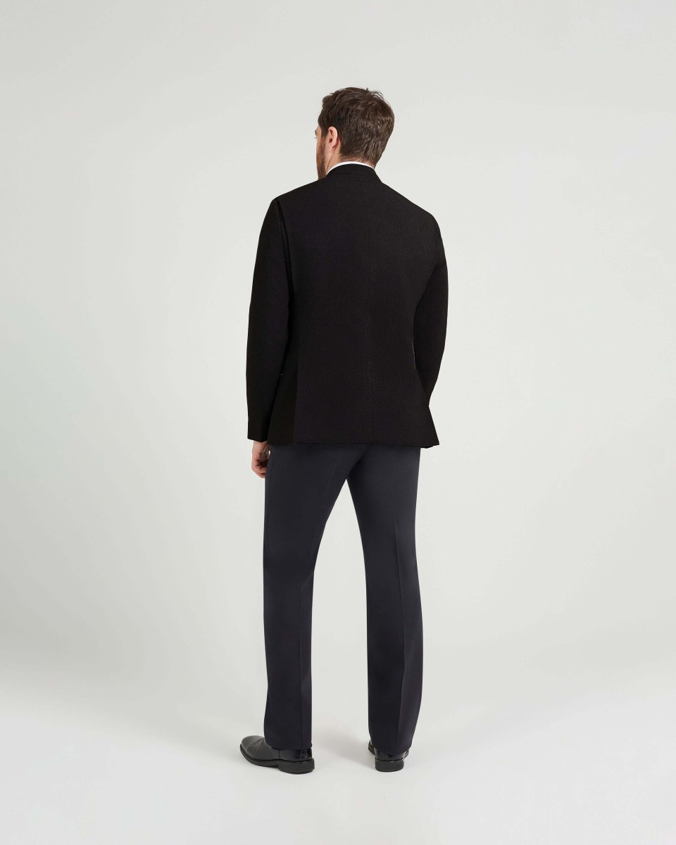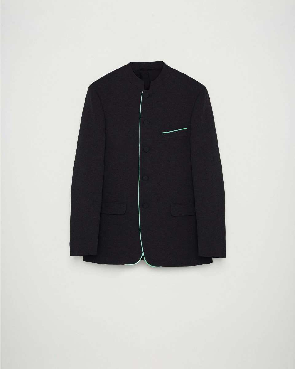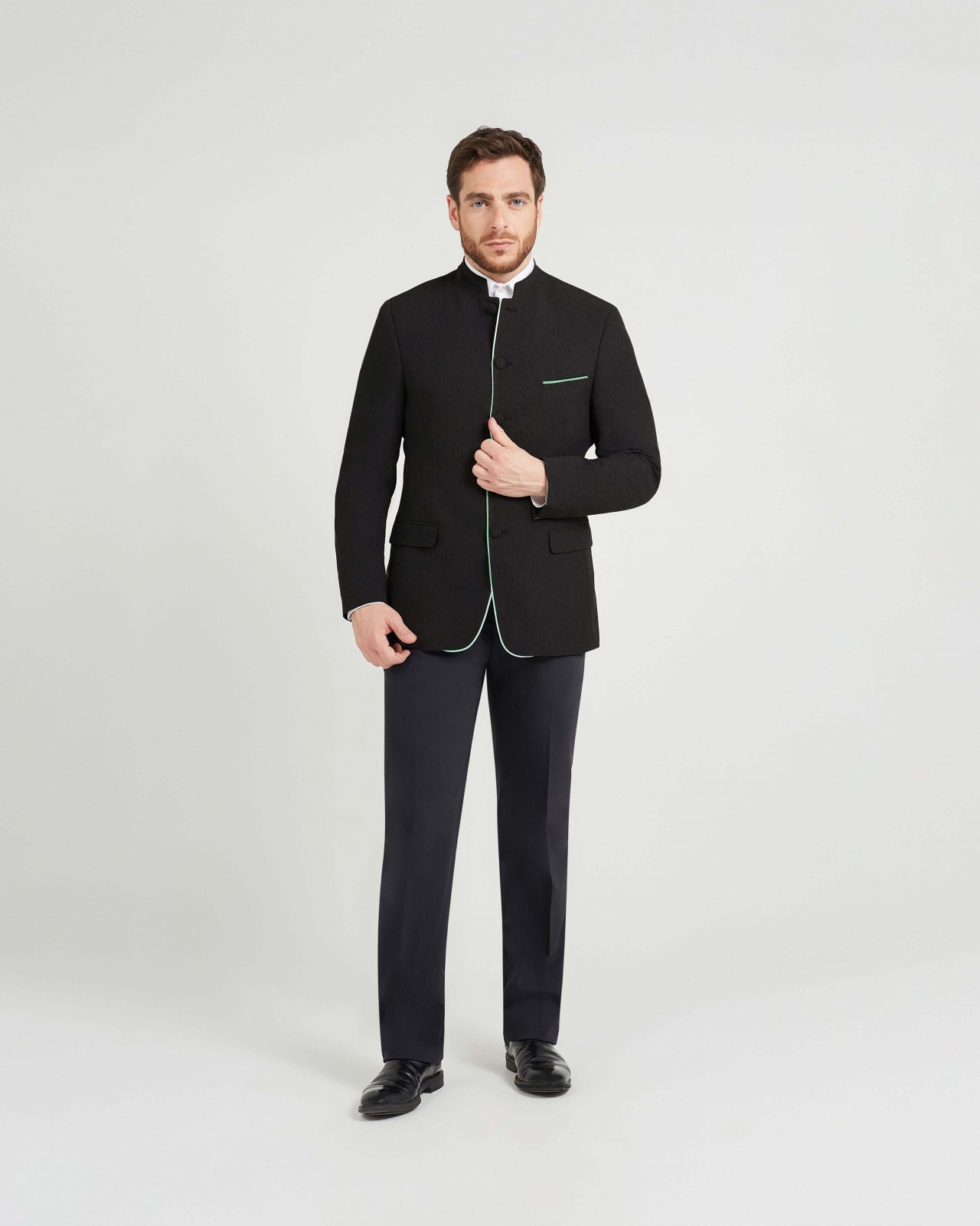 Veste doublée à col Mao. Fermeture par cinq boutons recouverts. Deux poches à rabat et une poche gilet sur la poitrine. Pinces devant et dos. Piping sur le bord de la veste et sur la poche poitrine. Coloris du piping au choix. Veuillez nous contacter pour toutes personnalisations de nos modèles.