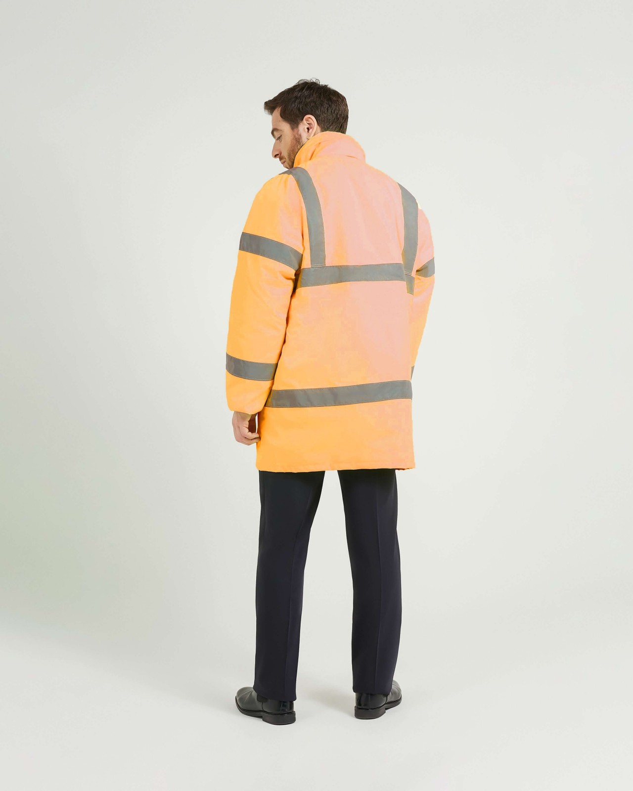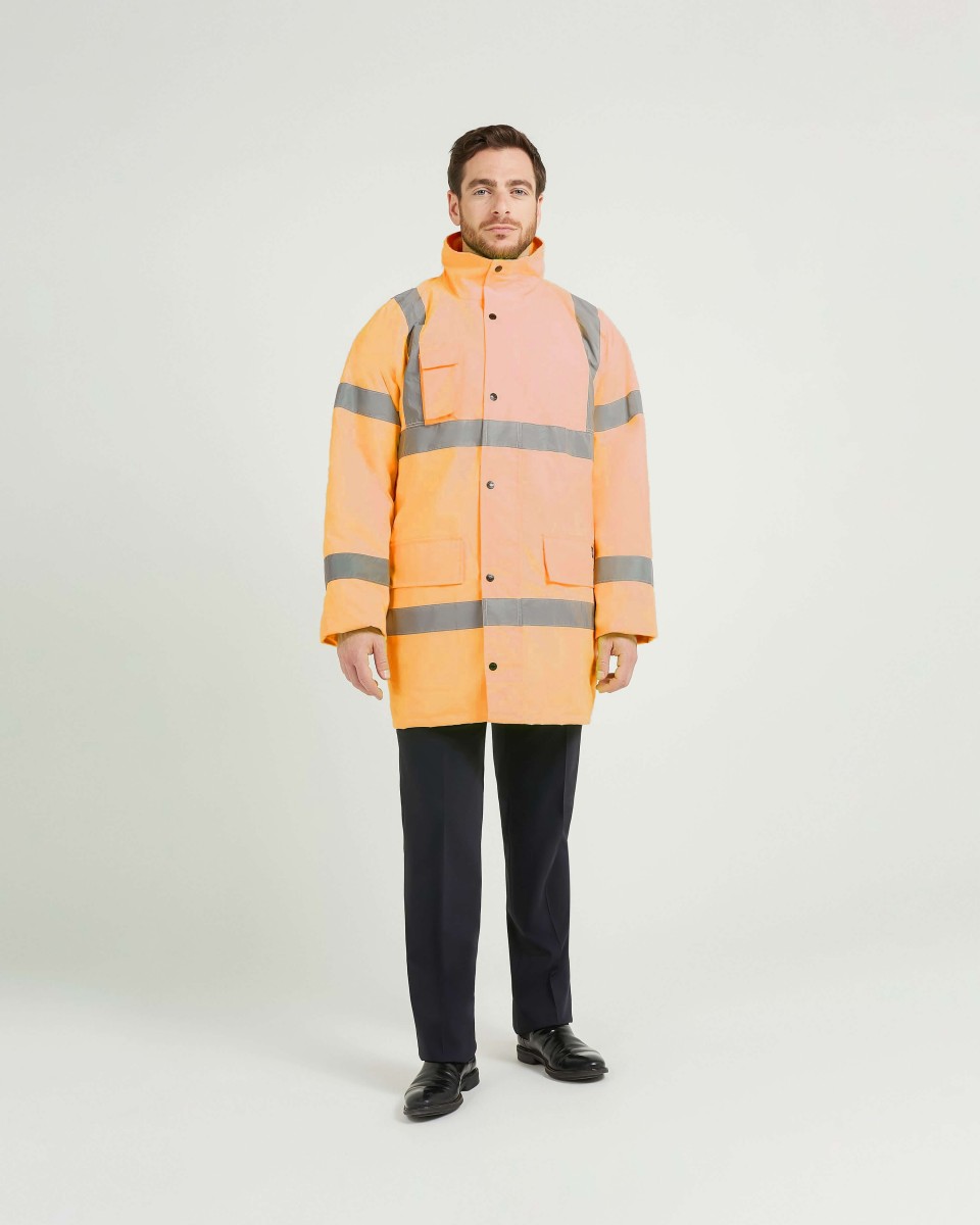 Manteau technique avec bandes réfléchissantes. Doublure matelassée. Coutures thermocollées étanches. Capuche dans le col. Normé ISO. Fermeture par boutons pression et zip. Poches à rabat et une poche interieure.